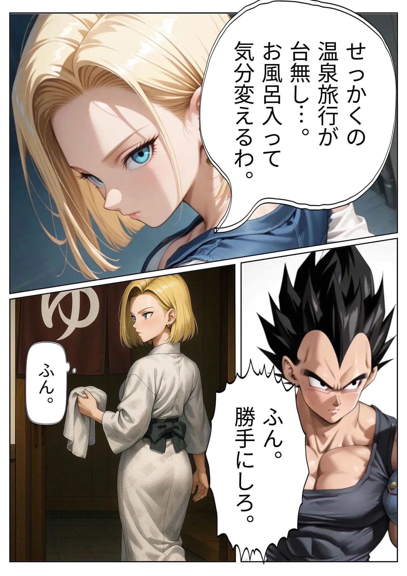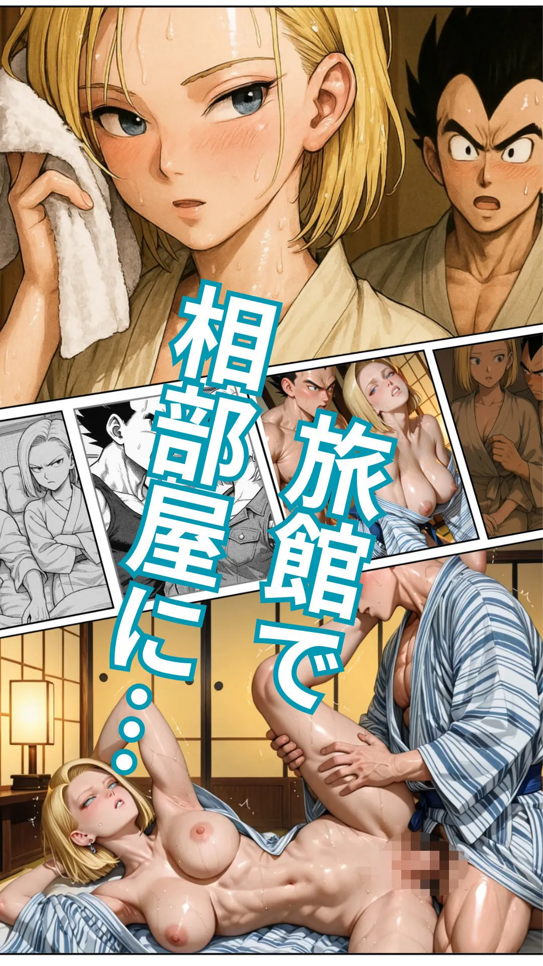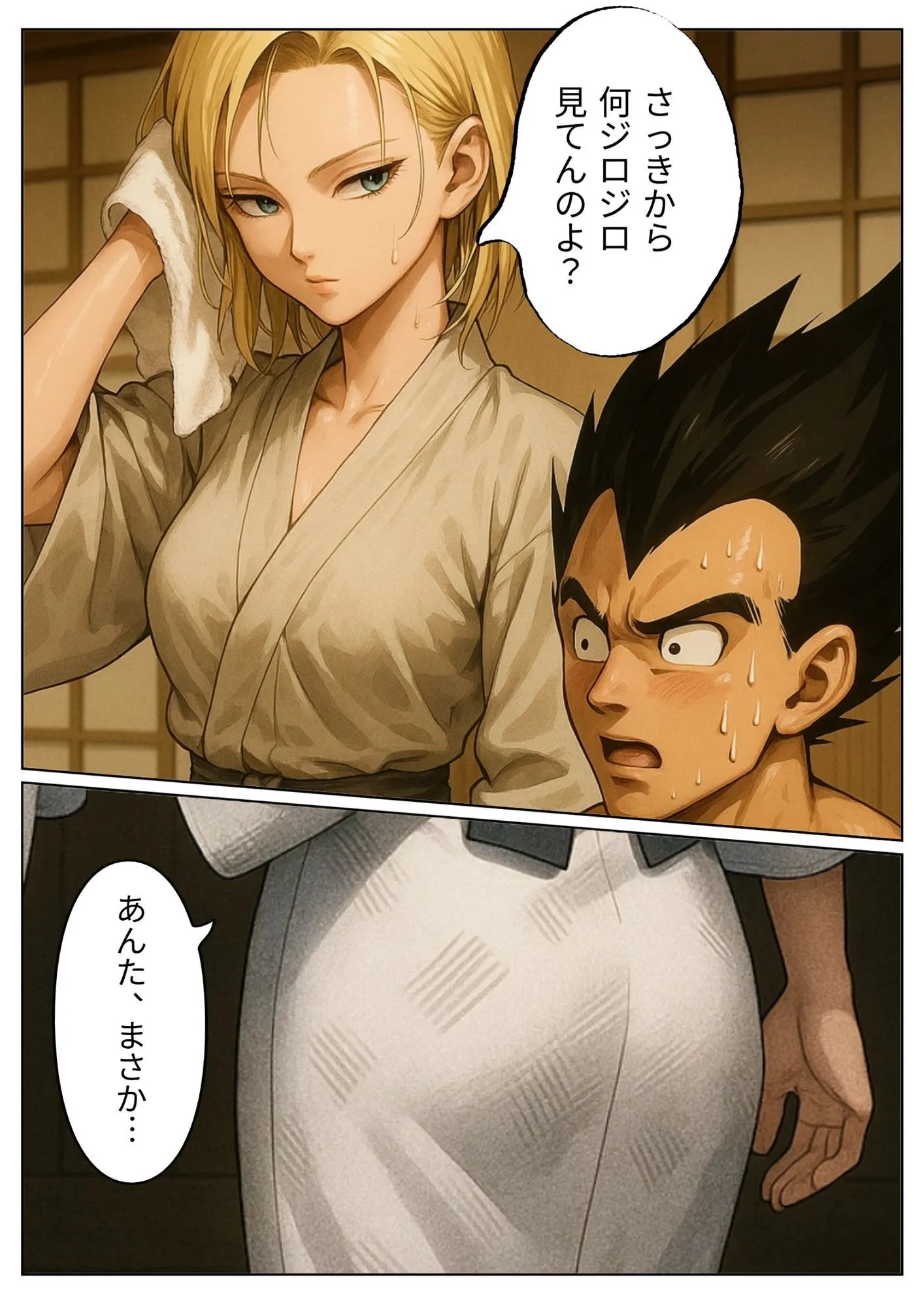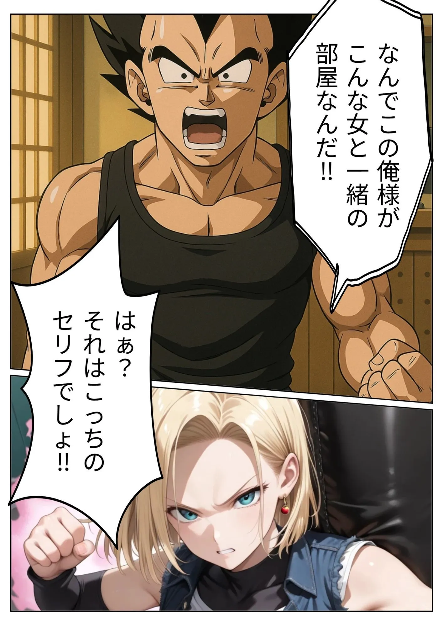 旅館の仲居さんに案内されて部屋に入った瞬間、二人は固まった。布団が二組、しかし間隔はピッタリ隣同士。「な、なぜだ!どうして俺様と貴様が同じ部屋なんだ!」ベジータが声を荒げる。『知らないわよ!受付で‘カップルさんですね’って言われた時に、否定しなかったアンタのせいでしょ?』18号がジロリ。「ぐっ……!あれは……面倒だからだ!」互いに睨み合ったまま、渋々浴衣に着替え、布団に向き合う。しかし――「……貴様の布団、こっちに寄りすぎだろう」『はぁ?アンタのがこっちにせり出してんでしょ』二人は布団を引っ張り合い、ガサガサと音を立てて小競り合いに。「くっ……俺の力をなめるなよ!」『こっちこそ!』結果、二人一緒にバランスを崩し、布団ごとドサッと転がる。顔が間近に迫り、互いに固まった。「……チッ、くだらん」ベジータは真っ赤な顔を逸らす。『……ほんとバカね。あたしもだけど』18号は笑って息をつく。気まずい空気を誤魔化すように、襖の外から「ガタッ」と音がした瞬間、二人は同時に振り向いた。思わず近づきすぎた距離に気づき、また沈黙。「……まあ……今だけはいいだろう」『……そうね、今だけは』布団の中、互いにくっついたまま、ぎこちなくも唇を重ねる。まるで喧嘩の延長戦みたいなキス。けれど、それが二人らしい。