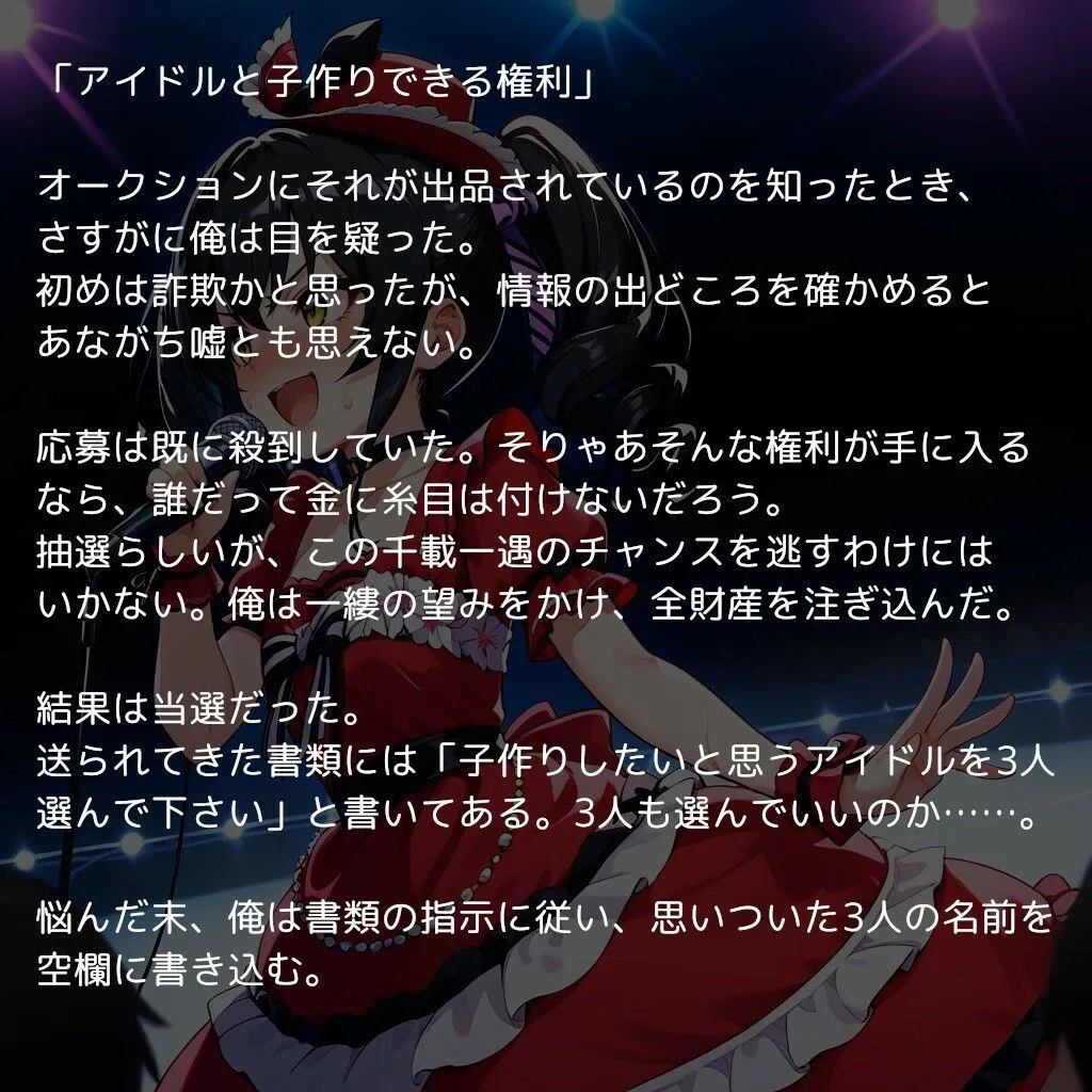 あかね『アイドルと子作りできる権利』オークションにそれが出品されてるのを知ったとき、さすがに目を疑ったよ