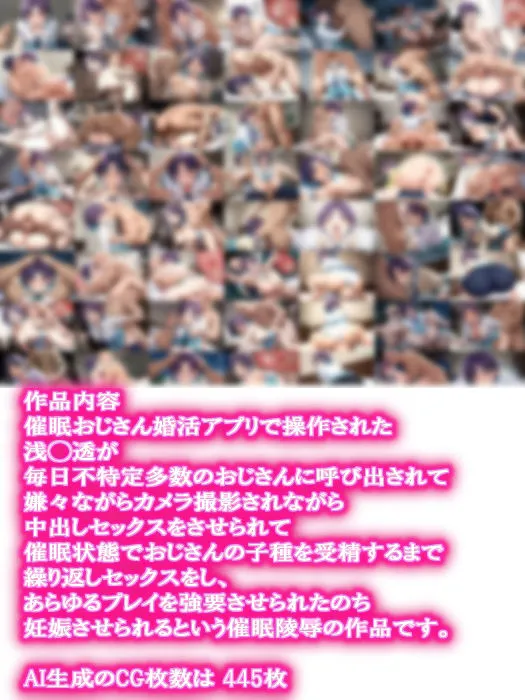 あかねこの作品は催眠おじさん婚活アプリで操作された浅◯透が毎日いろんなおじさんと嫌々ながらカメラ撮影されながら中出しセックスをさせられて催眠状態でおじさんの子種を受精するまで繰り返しセックスをし、あらゆるプレイを強要させられたのち妊娠させられるという陵辱調教の作品だよ