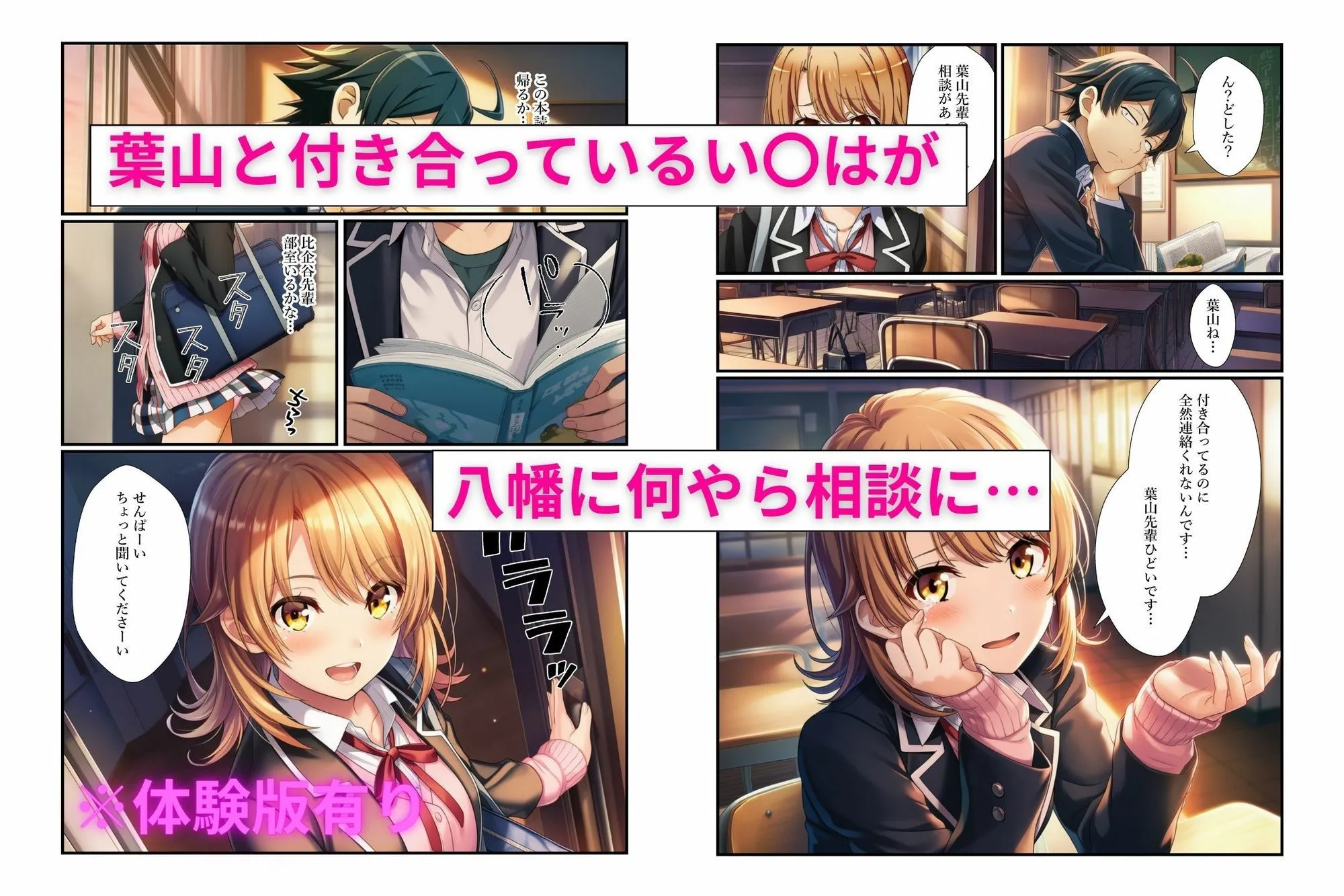ヒロイン3人の愚痴を聞いていたら、成り行きでセックスすることに…一〇いろは、雪〇下雪乃、由比〇浜結衣とキスハメ中出しセックス!【一〇編】葉山と付き合っている一〇がなにやら八幡に相談に…愚痴を聞いていたら、セックスする雰囲気に…まずは抱きしめあって舌を絡めてキスして…興奮してきた八幡…一〇にフェラチオしてもらうことに…八幡のデカチンコを見て匂いを嗅いで興奮する一〇金玉舐めてチンコを根元まで咥えたら…準備万端!最後はキスハメ中出しセックス!【雪由比〇浜編】寝不足で倒れて保健室で寝ている由比〇浜…お見舞いに来た八幡に倒れた理由を話す八幡の言葉に気持ちが高まってしまった由比〇浜は八幡をベッドに引きずり込む!キスしておっぱい揉んまれてセックスする流れに!全裸の由比〇浜に乳首をいじられて興奮する八幡…乳首をなめられながらチンコを挿入して騎乗位セックス!由比〇浜の激しい腰使いにすぐに射精してしまいそうになる八幡由比〇浜にチューされてそのまま中だし!今度は正常位で2回戦開始!子宮の奥をいっぱいついたら種付けプレスで最後は中出し!【雪〇下編】体育倉庫で片づけをしながら話していたら…閉じ込められてしまう八幡と雪〇下トイレに行きたかった雪〇下は最初は我慢していたが時間がたつにつれて我慢できなくなりおもらししてしまう…それを見て勃起してしまう八幡…恥ずかしそうにしながらもフェラしてくれる雪〇下デカチンを雪〇下になめさせて顔射!フェラで抜いてもらった八幡だが、まだまだ勃起が収まらない…そのままセックスすることに!後ろから雪〇下のまんこを突きまくる!服を脱いで全裸になった後は、騎乗位からの正常位で子宮をガンガンついて最後は種付けプレスでキスハメ中だし?俺ガイルなヒロインとの濃厚プレイをご堪能ください。各キャラクターの表情に力を入れておりますので、その時の心象を想像しながら読んでいただくとさらにお楽しみいただけると思います。※体験版は21ページあります。【収録内容】本編(カラー45P)全ページに台詞、擬音、加筆修正を行っています・一〇いろは【15P】・雪〇下雪乃【15P】・由比〇浜結衣【15P】【注意事項】・本作品はAI生成画像(NovelAI)に加筆して作成しております。