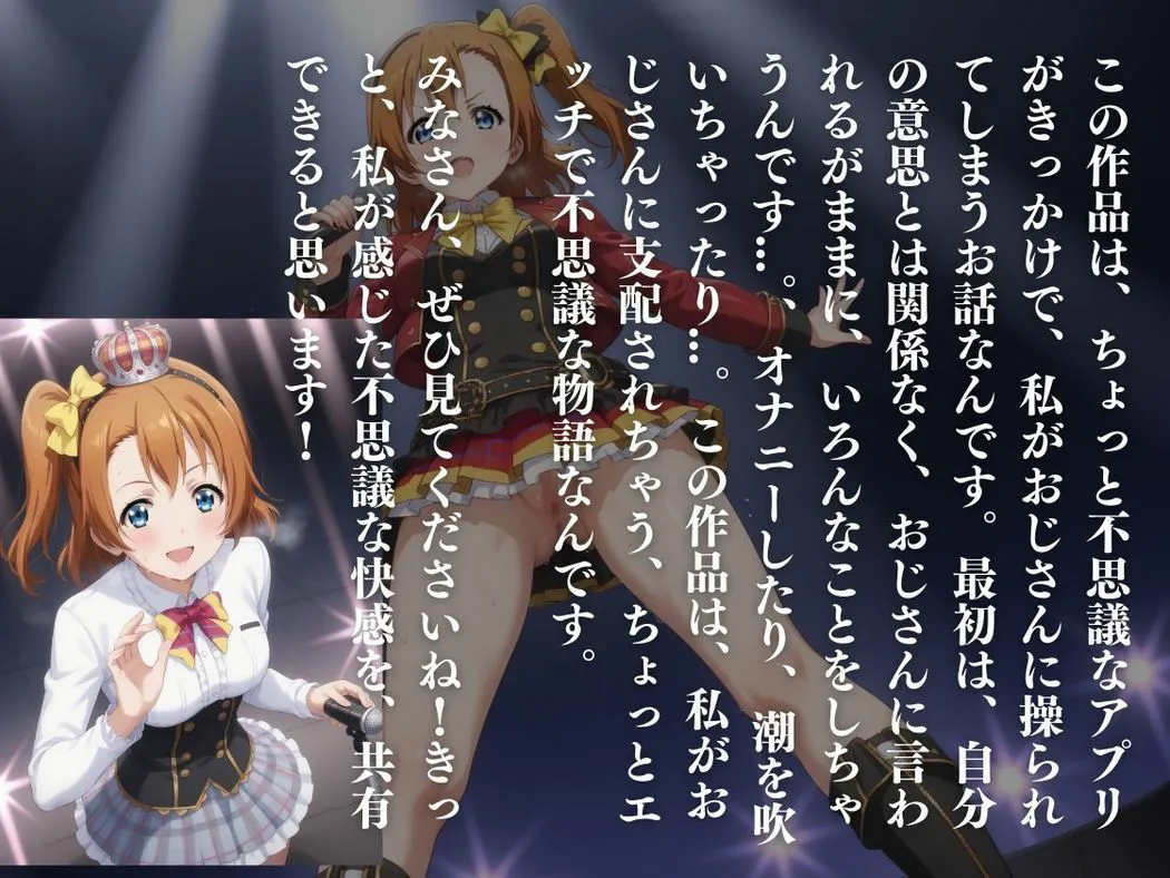 ラブラ●ブ!●●穂乃果がテーマで、収録内容はオナニーから始まるよ。ローター、ディルド、指入れオナニーだね