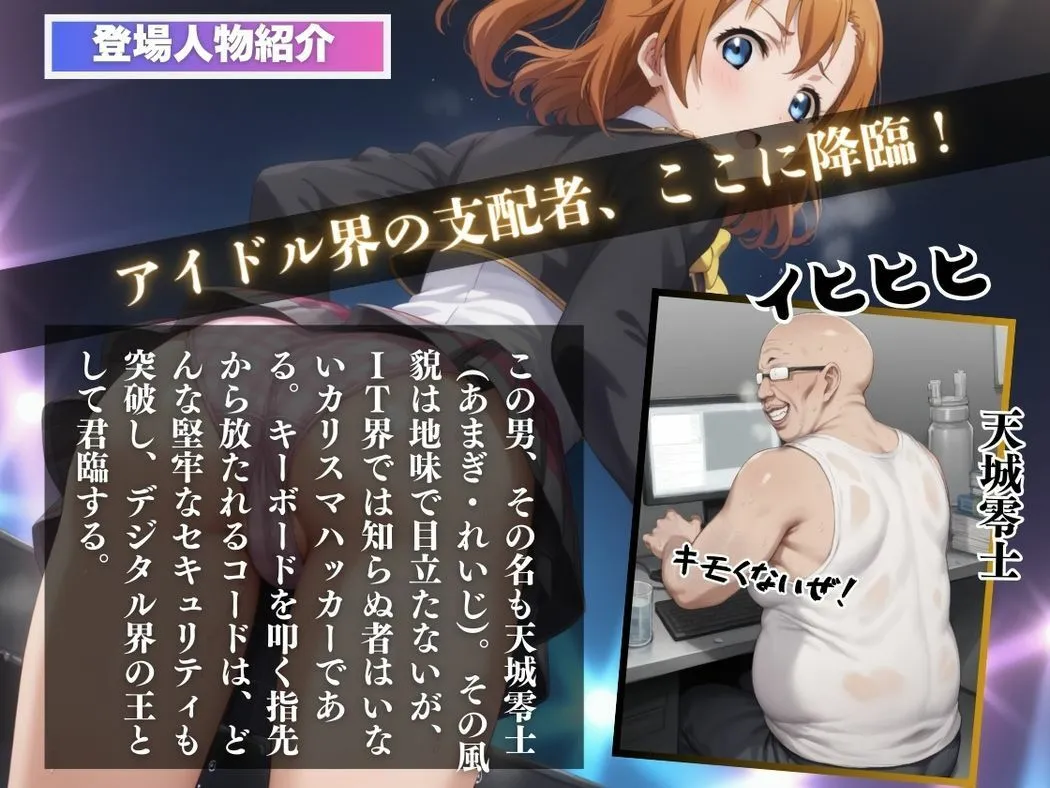 あかねこの作品は『彼女の笑顔の秘めた裏側 アイドルとおじさん』で、ギッシュで前向きな性格のアイドル●●穂乃果が謎のアプリでおじさんに支配されるCG集だよ