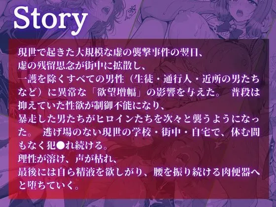 暴走した男たちがヒロインたちを次々と襲うようになって、逃げ場のない現世の学校・街中・自宅で休む間もなく犯され続けるよね