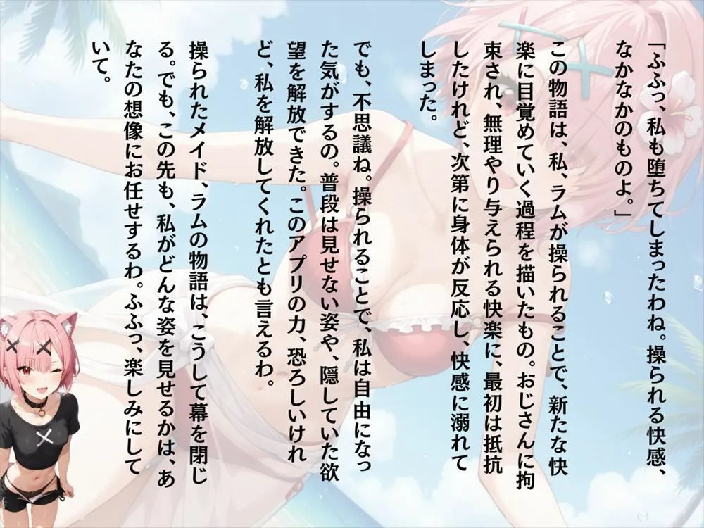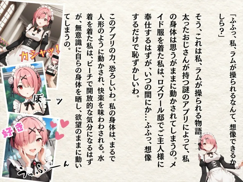 あかねこの作品は『操られたメイドの告白〜謎のアプリに操られ、欲望のままに身体が動く。〜』で、『Re:ゼロから始める異世界生活』の人気キャラクター、●ムをフィーチャーしたCG集だよ