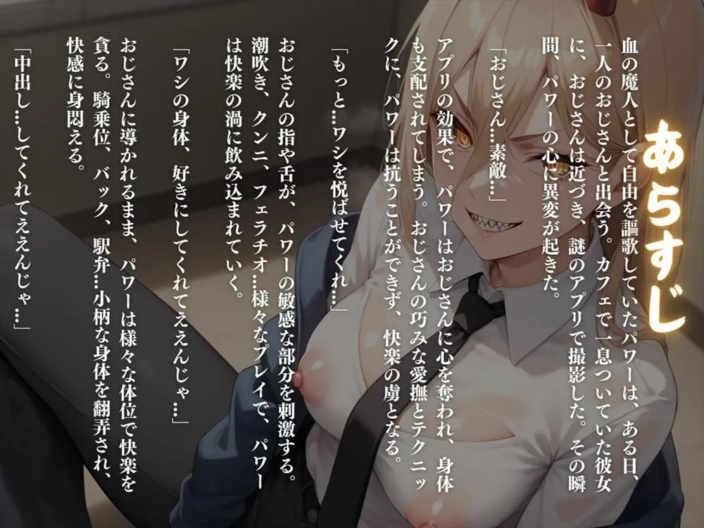 あかねこの作品は『操り人形は淫らな魔人〜暴れん坊の魔人、淫らな本能〜**「血の魔人」パワーとの淫らな契約-操られ、快楽に堕ちる物語**』で、チェンソーマンの血の魔人パワーが謎のアプリで操られておじさんに堕ちる話だよ