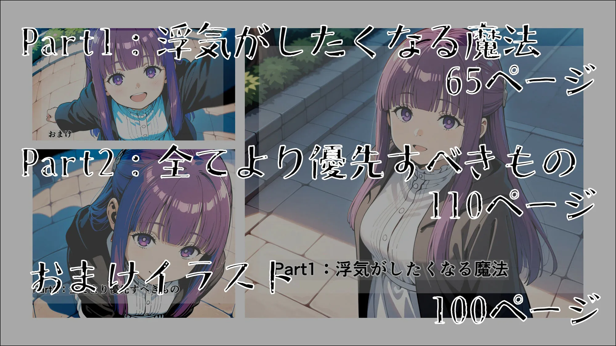 生成AIで作成したイラストを加筆修正してるんだけど、画像枚数はPart1:浮気がしたくなる魔法65ページ、Part2:全てより優先すべきもの110ページ、おまけ:100ページでしょ