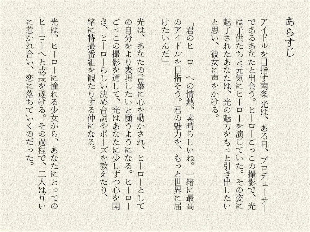 あらすじはアイドルを目指す南条光がプロデューサーであるあなたと出会う話だよ。ヒーローごっこの撮影で光は子供たちと元気にヒーローを演じてたんだ