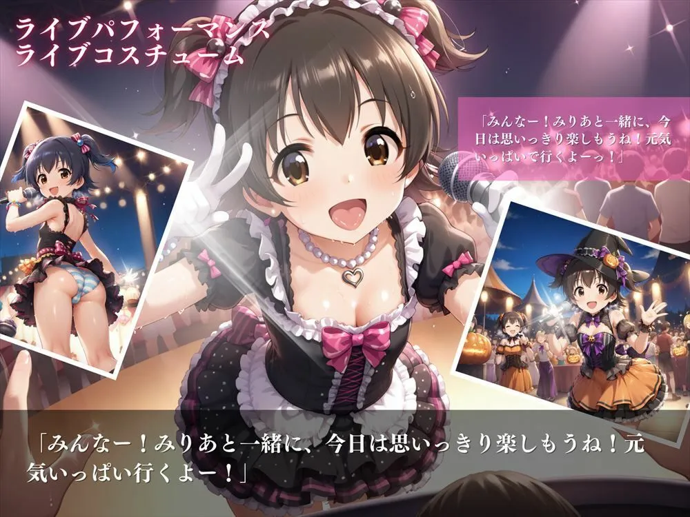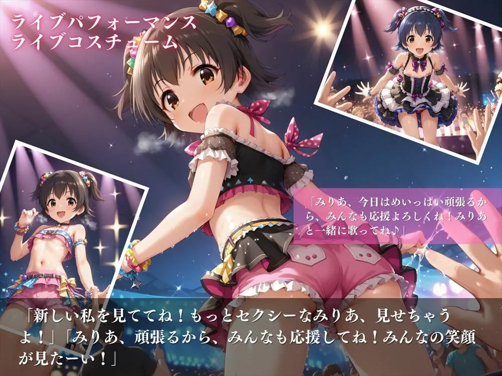 無邪気で明るいみりあがステージ上で元気いっぱいに歌い踊る姿はアイドルそのものでしょ。ライブコスチュームに身を包みキュートでセクシーなパフォーマンスを披露なのよ