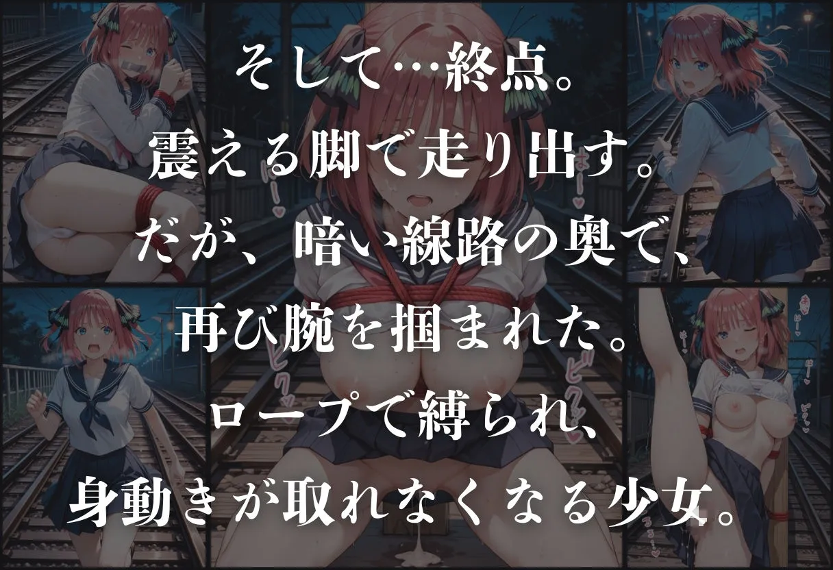 震える脚で走り出しても暗い線路の奥で腕を掴まれ、ロープで緊縛されて身動き取れなくなるでしょ