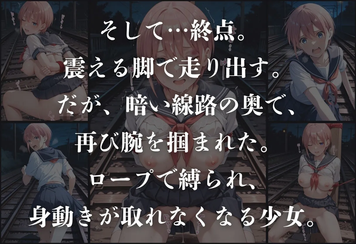 震える脚で逃げ出すけど暗い線路で腕掴まれてロープで緊縛。叫びは届かなくて再び貫かれるの