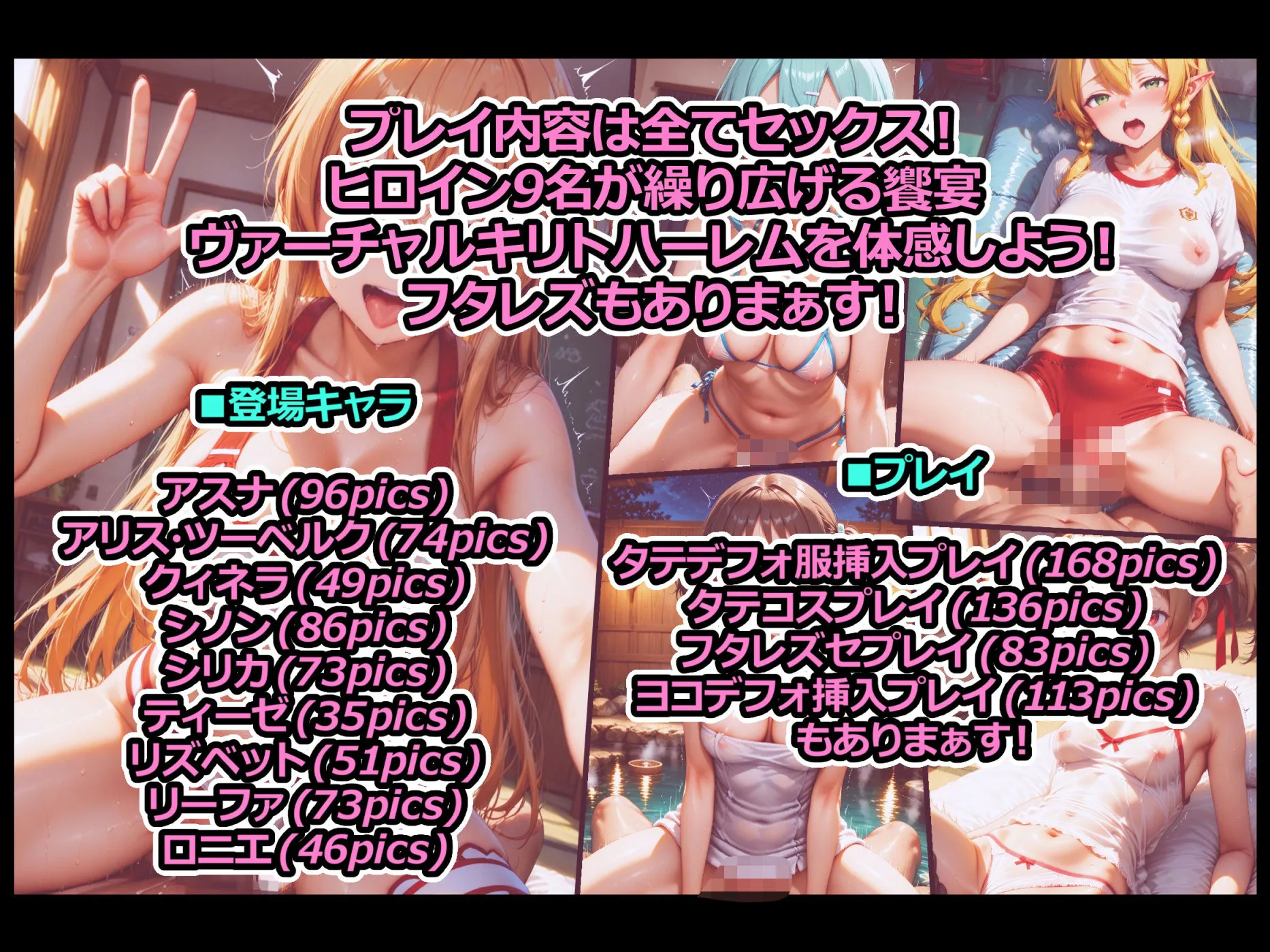 プレイ内容は全てセックスなのよ。ヒロイン9名が繰り広げる饗宴ヴァーチャルキリトハーレムを体感できるでしょ