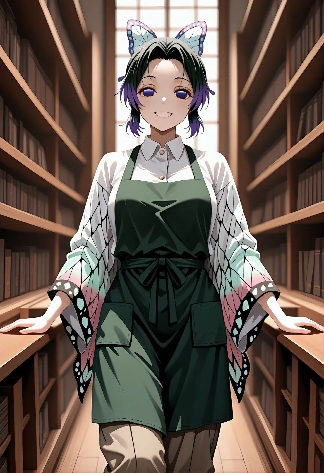 鬼殺隊の蟲柱・胡蝶〇のぶが任務の合間に立ち寄った図書館で司書の手伝いをしているのよ。静かな書架で本を整理しているうちに来館者の『透視眼鏡』で司書制服の下が丸見えになるでしょ