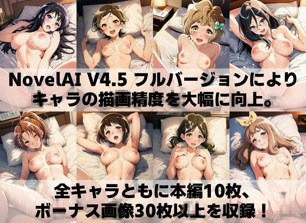 京都の吹奏楽部員も白く乱れたい――ユーフォなどを響かせそうな吹奏楽部員の白濁痴態を余すところなく収録!陰毛好きの方、中◯し好きの方に特にオススメです。※画像は全てNovelAIV4.5で生成した最新版です。既存商品とイラストの重複はありません。※生成可能キャラの増加に伴い、過去の商品とは収録キャラの区切りを変更しています。全キャラともに、「白濁セ◯クスV4.5」本編には必ず以下の内容を含んでいます。・騎乗位×4(または3)・正常位×3(騎乗位3の場合は正常位4)・バック×1・事後(全身×1、上半身アップ×1)【商品内容】・「白濁セ◯クス」本編画像:1キャラあたり10枚×9キャラ=90枚・ボーナス画像:総勢283枚(1キャラあたり30枚台)計373枚※CGはNovelAIV4.5を使用しています。サイズは832×1216ピクセルです。※各画像はいわゆる差分ではなく、全て異なるイラストです。既存商品とイラストの重複はありません。※本商品は吹奏楽部員のイメージに寄せたパロディであり、パロディ元作品とは一切関係ありません。※本商品のイラストは全て成人(18歳以上)の設定で描画しています。