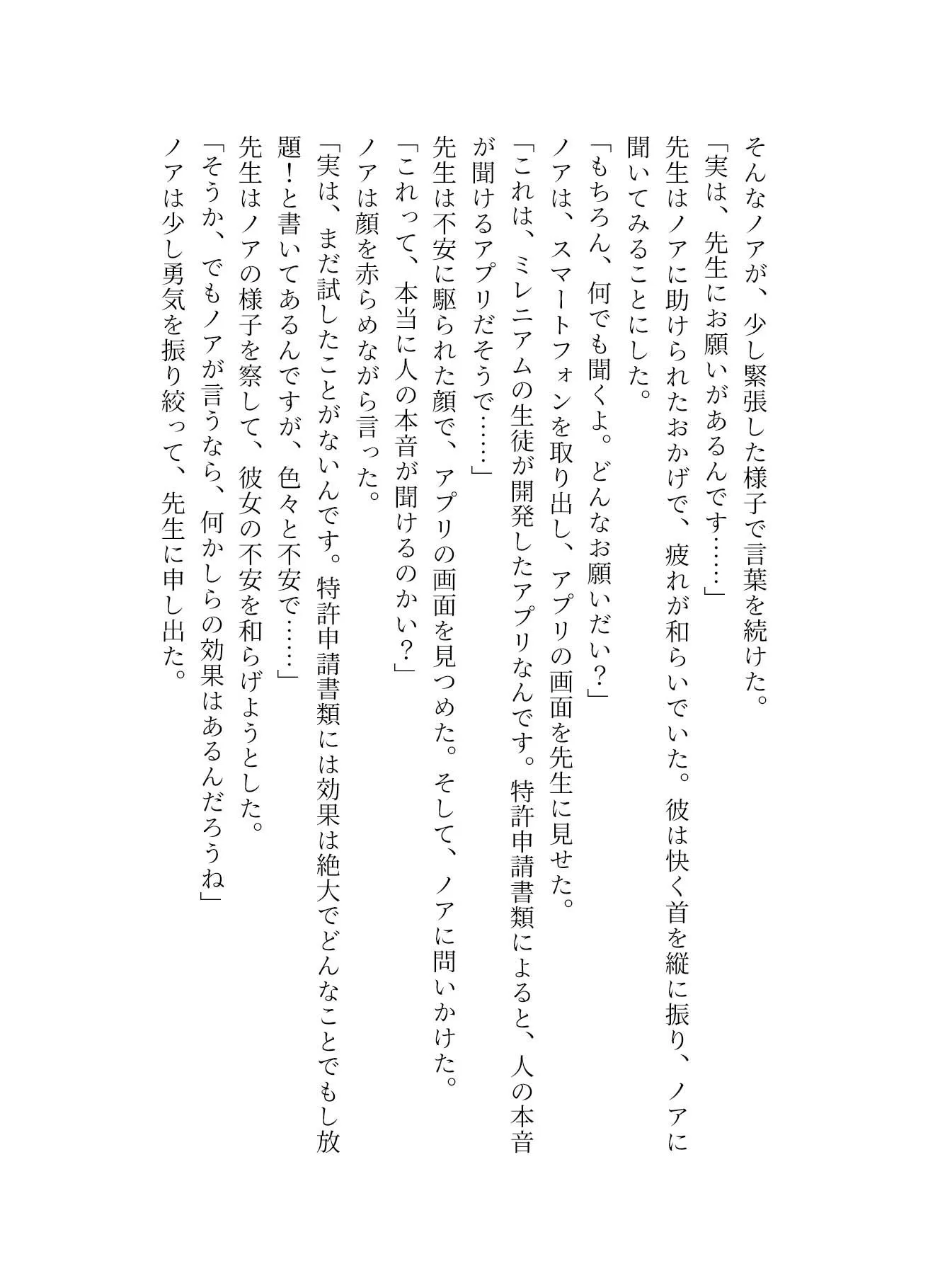 それからノアは先生に特許申請中のアプリを見せて、人の本音が聞ける機能を試してほしいって頼むわ