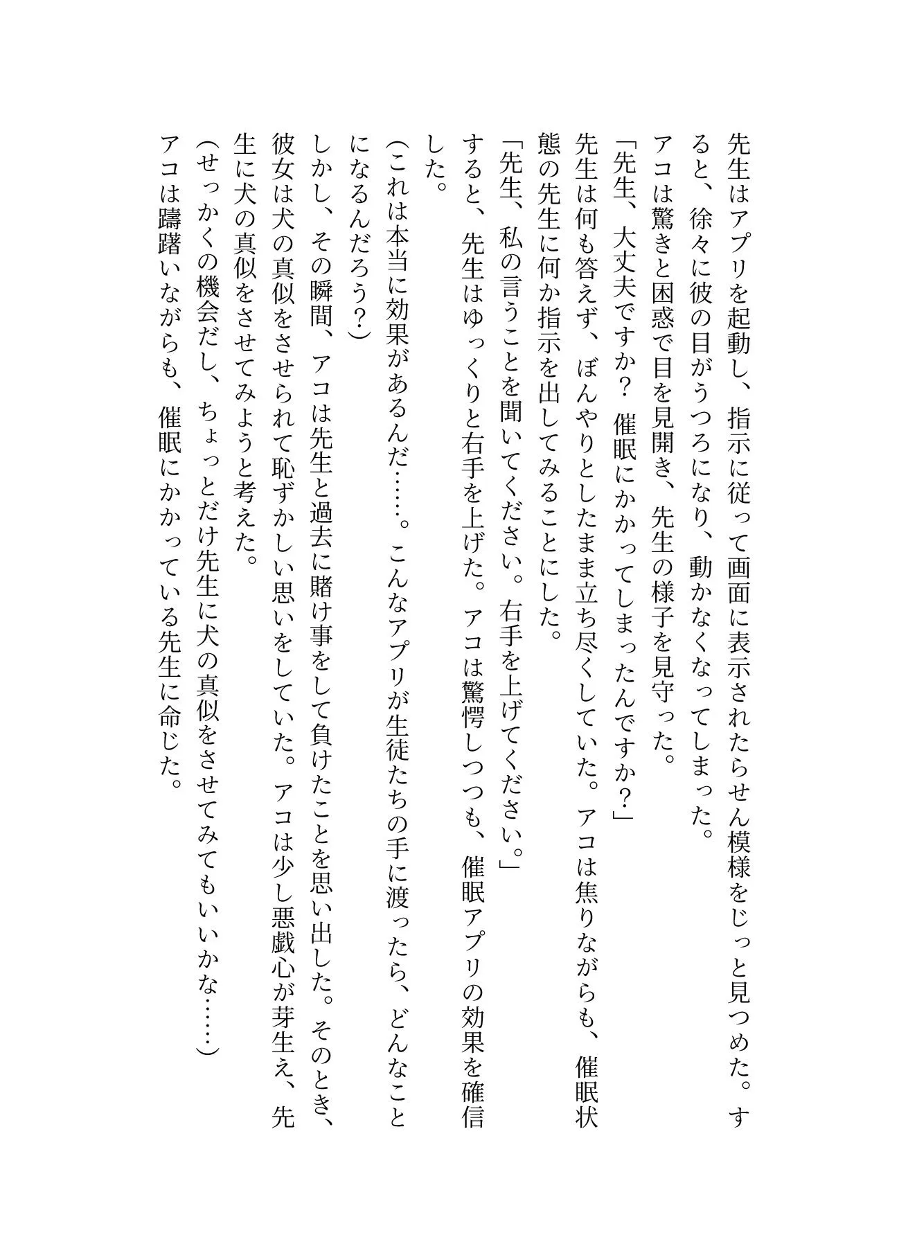 アプリを使って先生を催●状態にすると、彼はアコの命令に従って犬の真似をし始めるわ