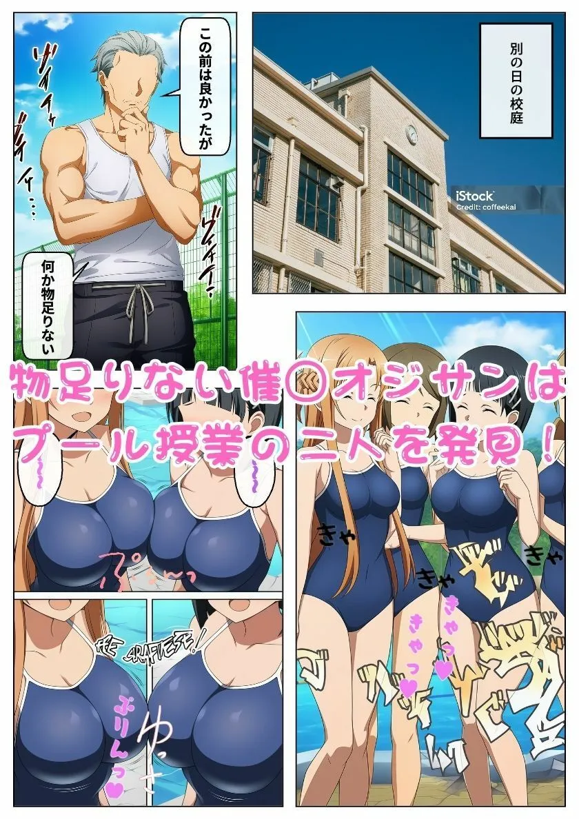 それだけで満足しないオジサンはプール授業でスク水姿の二人を見つけるわ