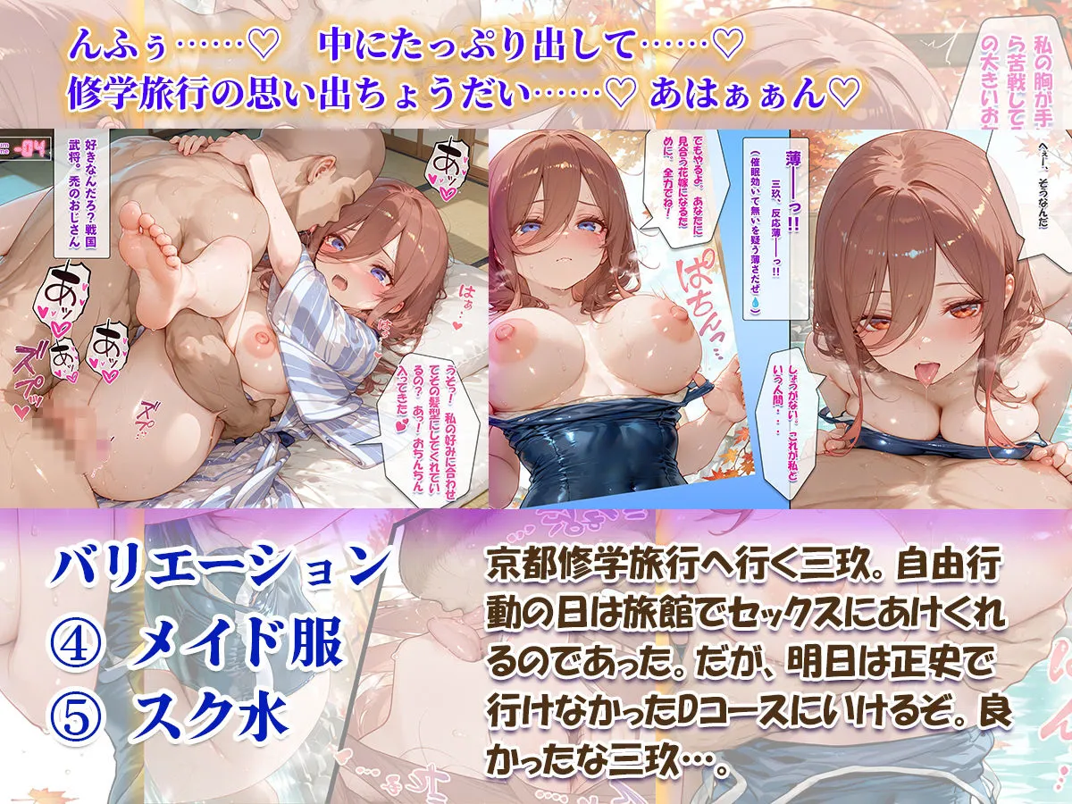 第三話『三玖と一緒にイく京都修学旅行』は25枚。修学旅行で人の目を盗んで旅館セックス、スク水での露天風呂セックス。確変未来のエロ三玖修学旅行編だね