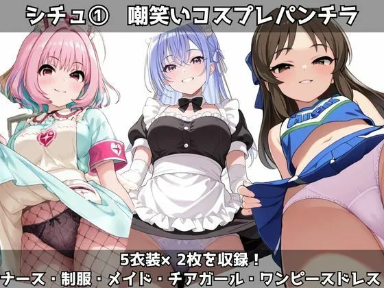 シチュエーション1は嘲笑いコスプレパンチラで、ナース・制服・メイド・チアガール・ワンピースドレス計5衣装×2枚収録なのよ