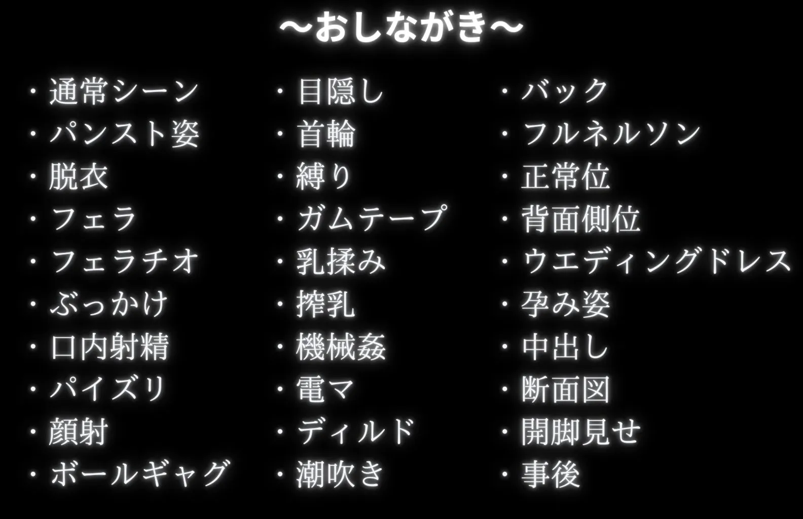 おしながきは通常シーンから始まって、パンスト姿、脱衣、フェラ、フェラチオ、ぶっかけ、口内射精、パイズリ、顔射があるよね
