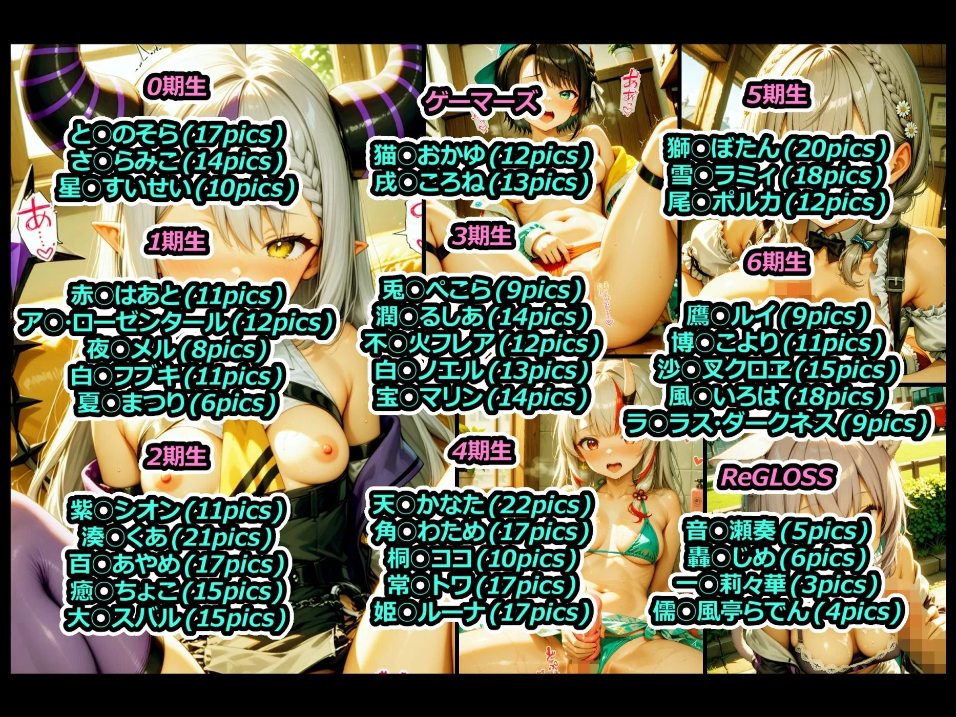 1期生赤○はあと11pics、ア○・ローゼンタール12pics、夜○メル8pics、白○フブキ11pics、夏○まつり6picsだね