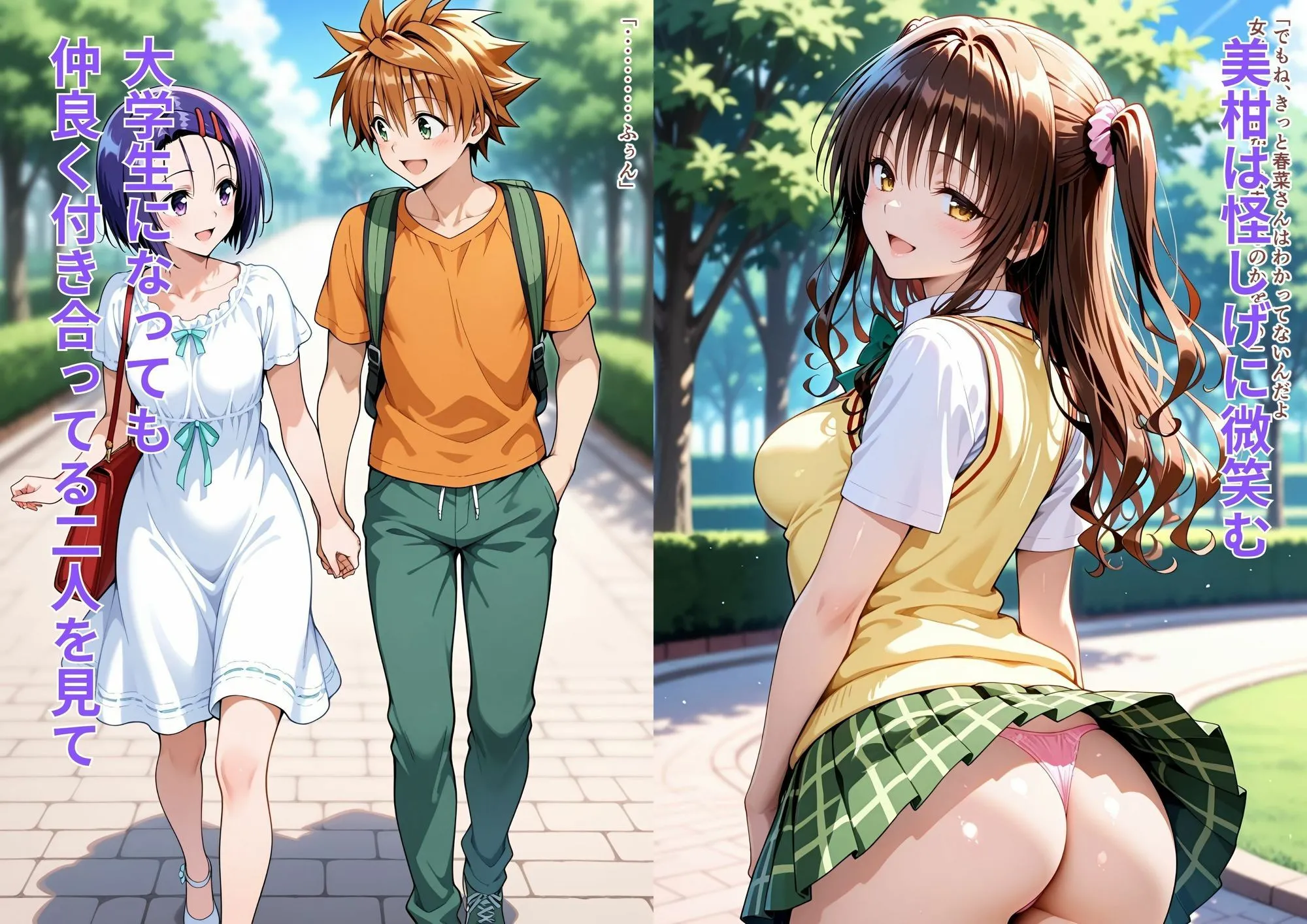 内容はホテルエッチからで、美柑と春菜の、下着、制服、キス、後背位、正常位、中出し、アクメなどがあるよ