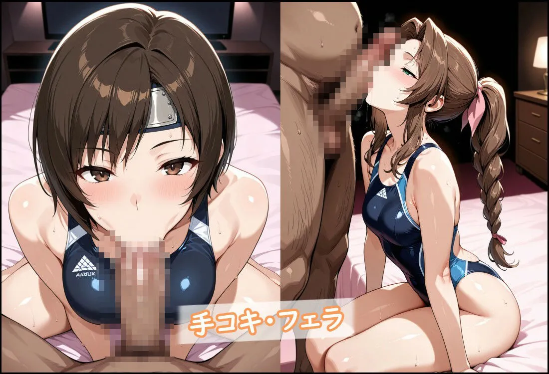 もはや彼女たちは、おじさんの苗床でしかなかったわ。内容内訳はティファ165枚、エアリス155枚、ユフィ155枚で、全編競泳水着なのよ