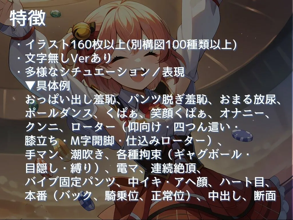 多様なシチュエーションと表現が特徴で、おっぱい出し羞恥やパンツ脱ぎ羞恥、おまる放尿、ポールダンスなんだけど