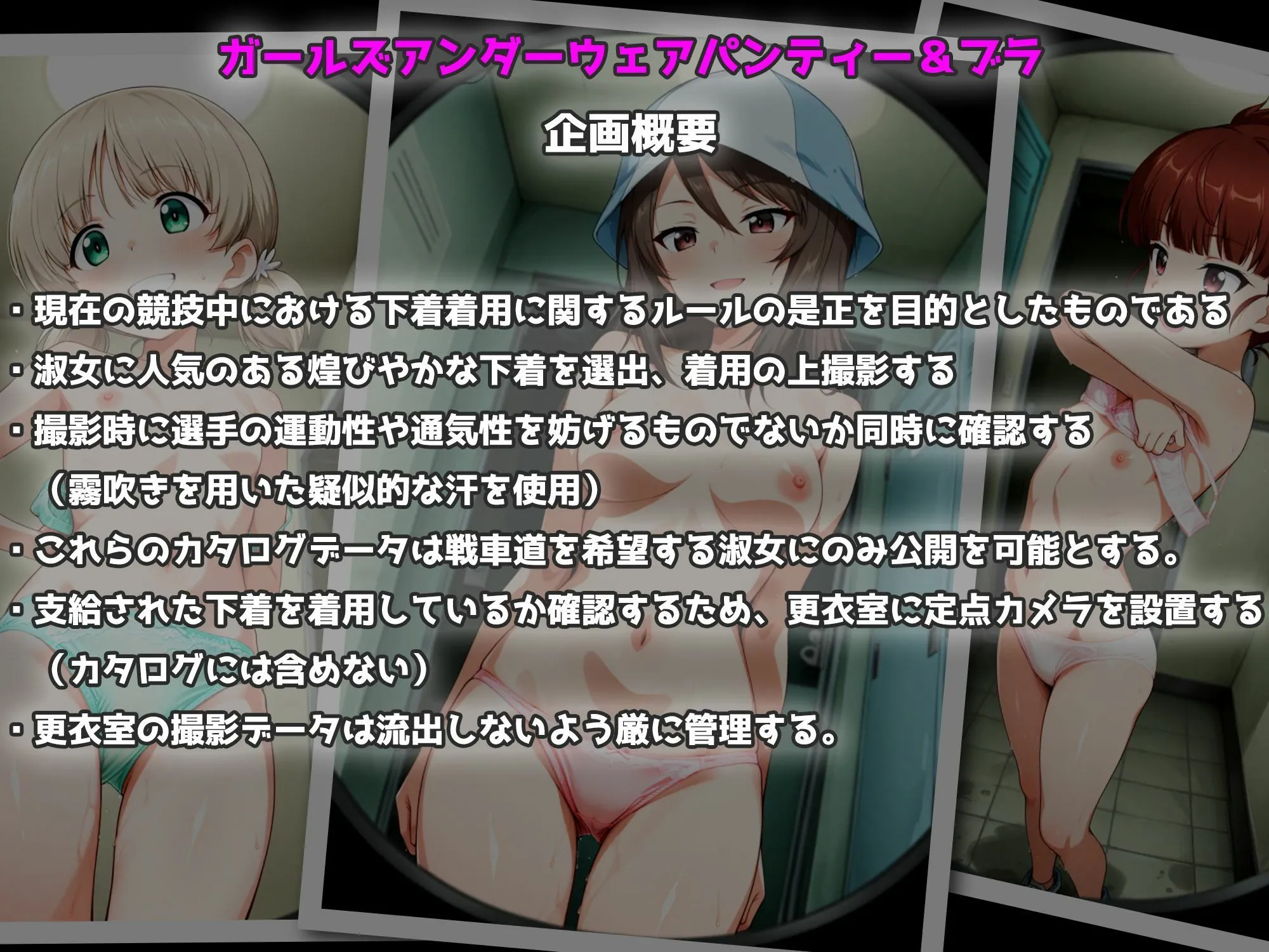 戦車道の裾野を広げるチャンスに、戦車道連盟は現役選手をモデルとした『戦車道推奨下着カタログ』、通称『ガールズアンダーウェアパンティー&ブラ』を企画したのよ