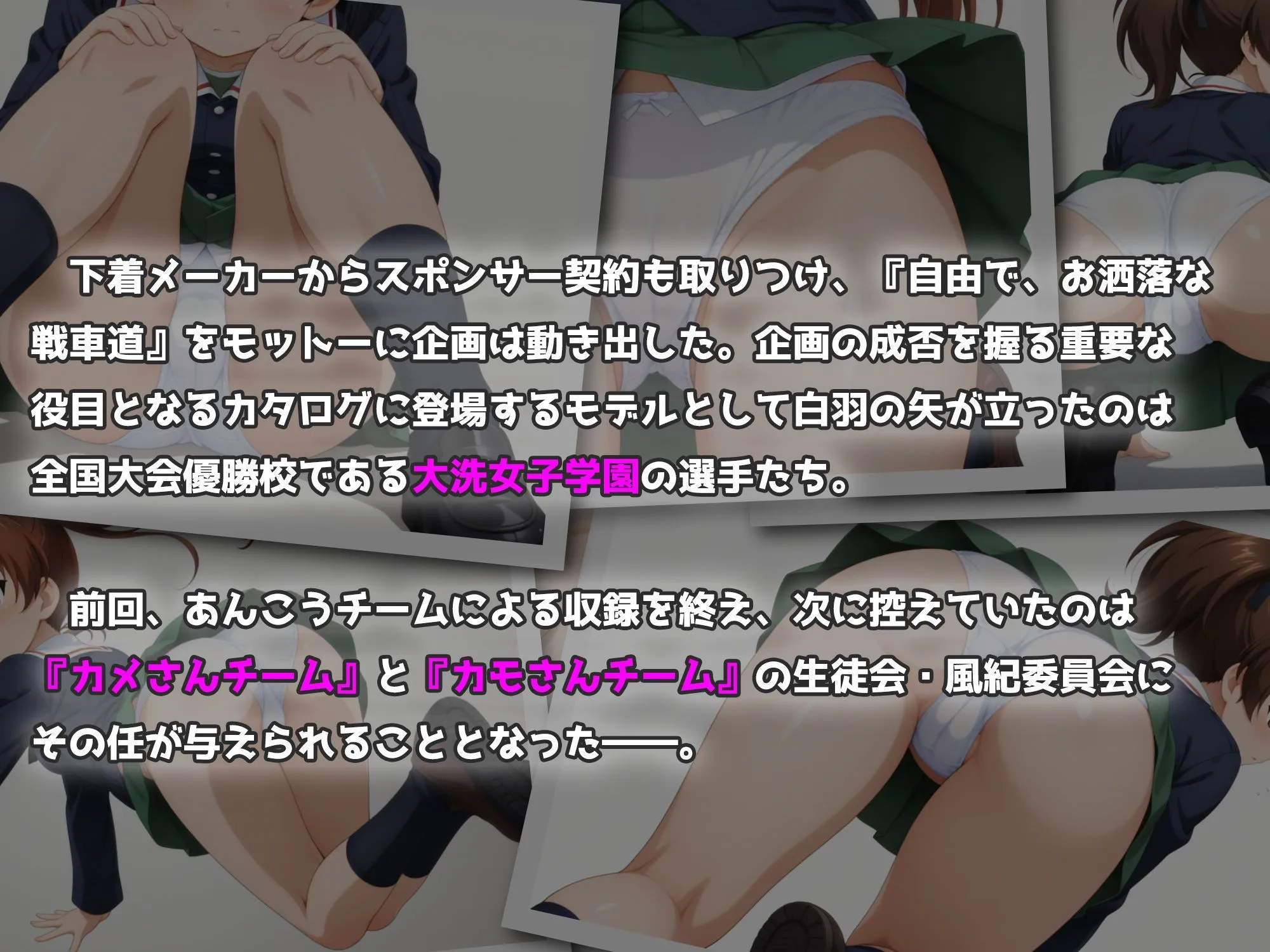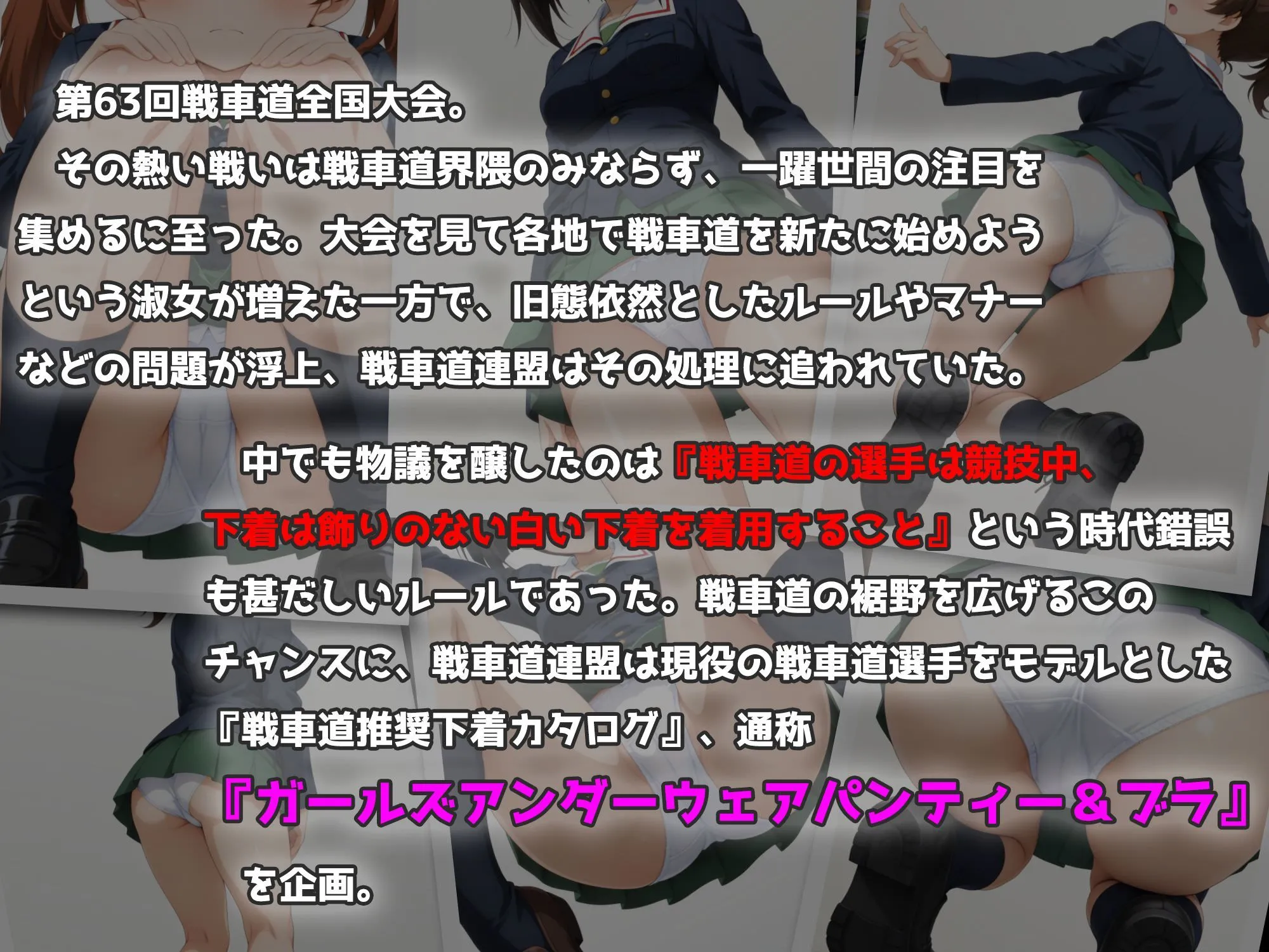 戦車道連盟は現役選手をモデルとした『戦車道推奨下着カタログ』、通称『ガールズアンダーウェアパンティー&ブラ』を企画。下着メーカーからスポンサーも取りつけたわ