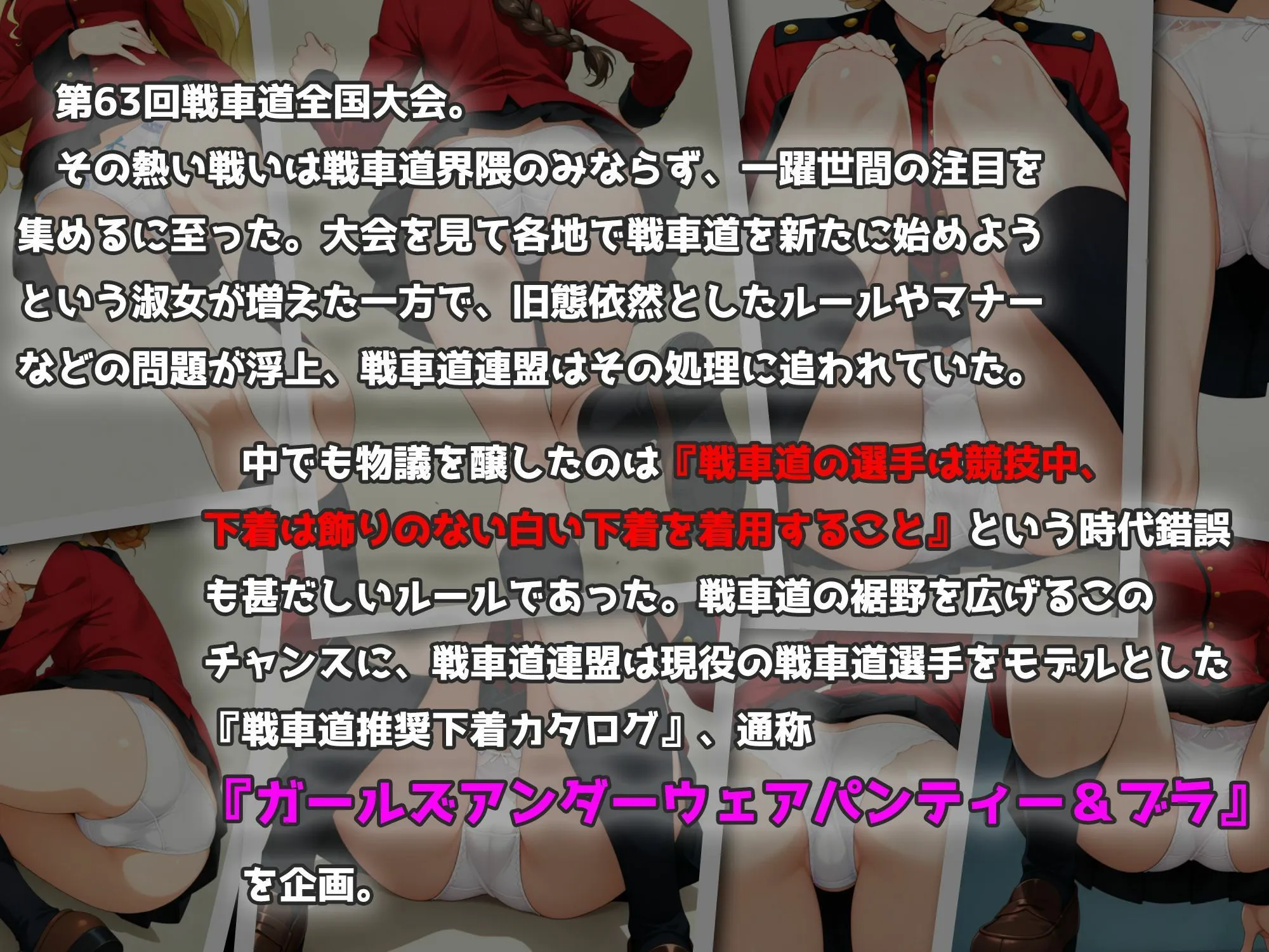 戦車道連盟は裾野を広げるチャンスに、現役選手をモデルとした『戦車道推奨下着カタログ』、通称『ガールズアンダーウェアパンティー&ブラ』を企画したよ