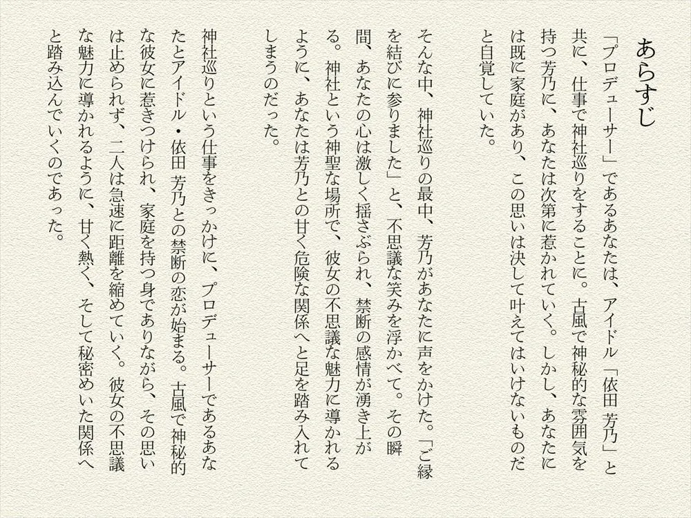 神社巡りをきっかけに家庭持ちのプロデューサーと芳乃の禁断の恋が始まって急速に距離を縮め、甘く熱く秘密めいた関係になるよ