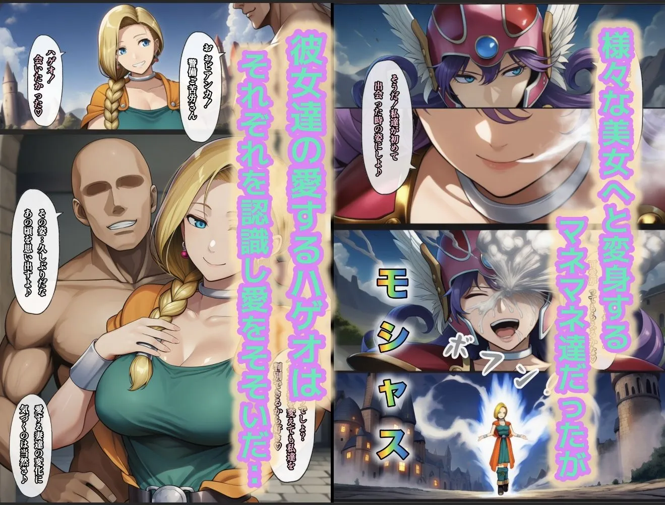 注意総ページ数はぴんぴん丸の追加ストーリーへの興奮度で変動する可能性があります。・何故かマネマネ(♀)ばかり仲間になる魔物使いの話冒険の書134P・何故かマネマネ(♀)ばかり仲間になる魔物使いの話冒険の書233P・何故かマネマネ(♀)ばかり仲間になる魔物使いの話冒険の書334P・最終話「マネマネ都市で幸せ結婚式」50P☆完全フルカラー総ページ数140Pの大ボリューム通常追加エピソード50ページを追加収録し税込990円です♪ぴんぴん丸の作品では珍しい「主人公が女性を愛するラブラブハーレム」な世界観をお楽しみ下さい。追加エピソード:最終話「マネマネ都市で幸せ結婚式」概要最終話「マネマネ都市で幸せ結婚式」ハゲオの愛するマネマネたちは、人間の女性に取り憑くことで子を孕む力を手に入れた。しかし魔物としての力が勝り、腹に宿ったのはマネマネの幼体だった。?幼体たちは母体の思考を強く受け継ぎ、ハゲオへの狂信的な好意を抱く。次々と人間に取り憑かせた結果、ハゲオはかつて自分を追放した都市を陥落させる。マネマネたちと築いた楽園都市で、町民たちとやりたい放題のハゲオ。祝福の嵐の中、4人の美女マネマネと合同結婚式を挙げる。熱く甘い初夜に溶け合うハゲオ――彼の本当の幸せは、ここにあったのだ。総ページ数151ページ※注意※・この作品はnovelAIより生成された画像に加筆修正して製作しています。・作者ぴんぴん丸は「自分がヌける」をコンセプトに作品作りをしています、オナニー以外での目的での購入はお控え下さい。(キリッ)・オナニー目的の為「クンニ」の描写は一切ありません。・軽度なスカ要素が含まれる場合があります(飲尿等の尿描写)、糞描写はございません。ぴんぴん丸の作品検索ワード#催#催○#催●#操作#ai生成#ハーレム#アナル#AI#フルカラー#常識改変#洗脳#チート#アプリ#奉仕#従順