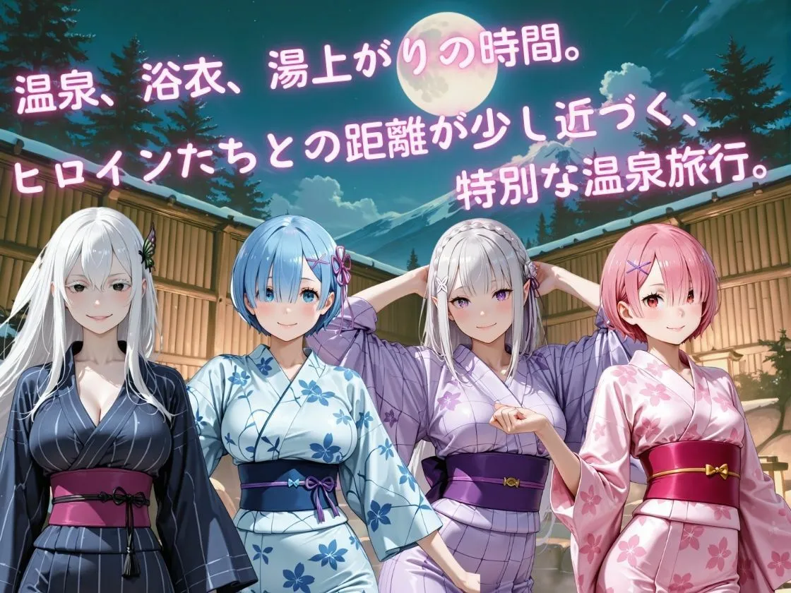 温泉、浴衣、湯上がり、夜の宿で過ごす穏やかな時間。四人のヒロインと忘れられない温泉旅行だよ