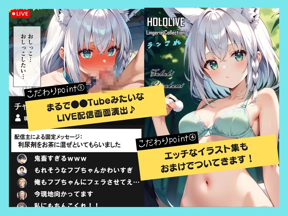 白上フブキ編は露出おさんぽを強●されるフブキがおしっこ我慢フェラチオをさせられたり、ハメ撮りを配信されたりするよね