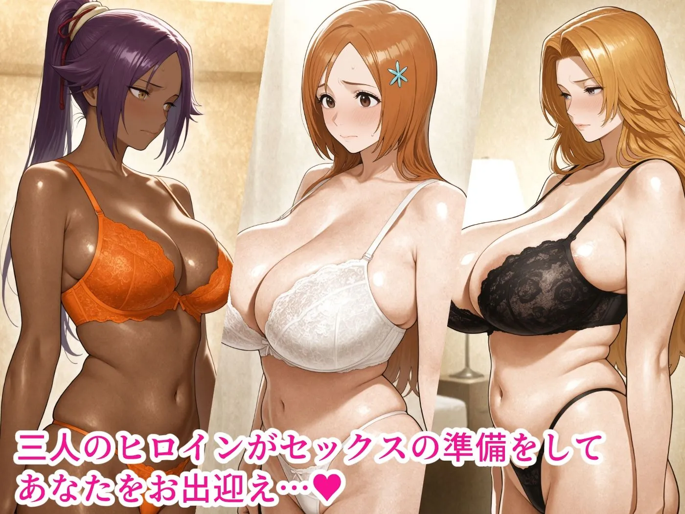 シチュエーションは井〇織姫が下着・盾舜六花・フルヌード、四〇院夜一が下着・レオタード・フルヌード、松〇乱菊が下着・金ビキニ・フルヌードだよ