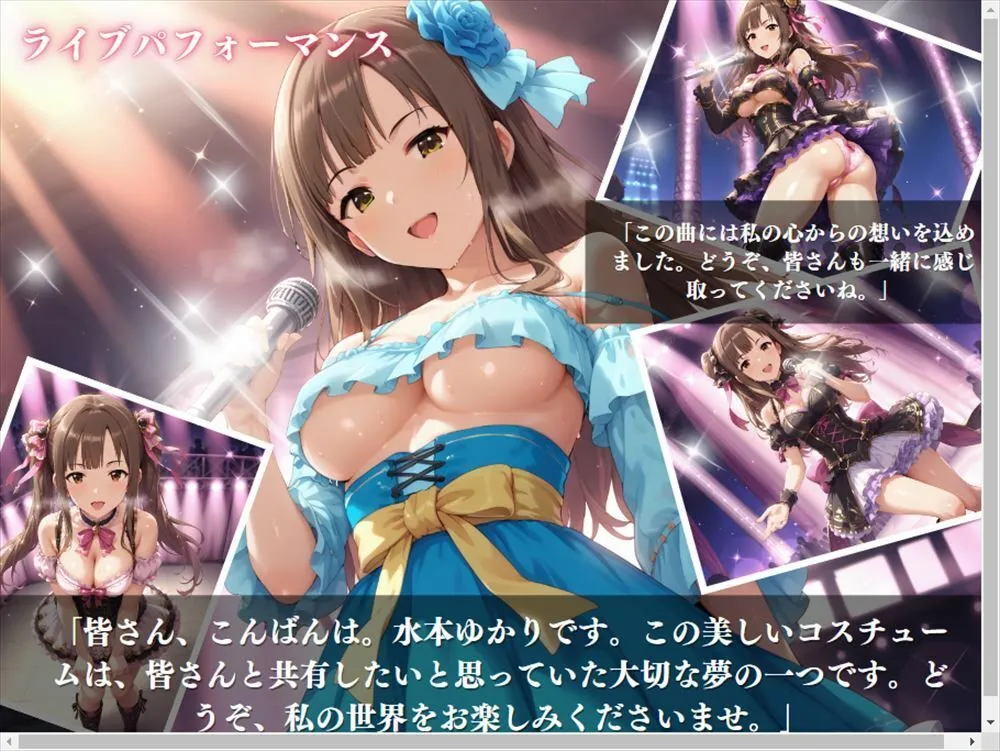 そんな彼女があなただけに魅せるアイドル活動の舞台裏を覗いてみて。ライブパフォーマンスではキラキラ輝くコスチュームに身を包み、少し大胆な姿も見られるよね