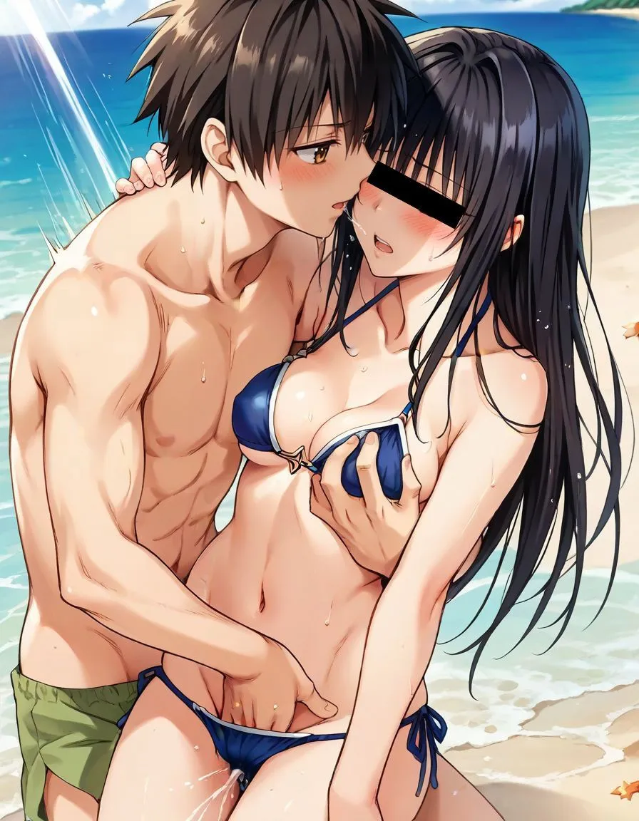 物語の構成はまず夏の浜辺編で、浜辺でふだん着・水着の全身画像ポーズから始まるわ