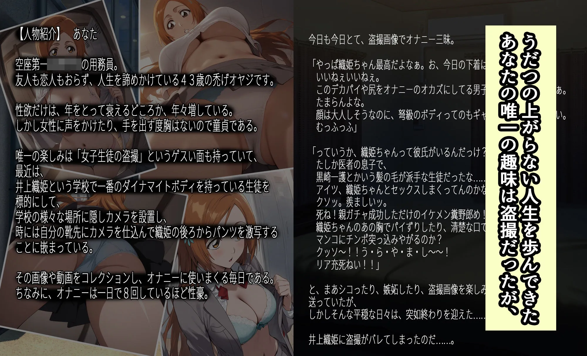 世界に平和をもたらした黒崎◯護たちは、役目を終えて日常生活に戻り、一般人として人生を謳歌している。そんな平和な世界で生きる死神代行の仲間に忍び寄る危機。「盗撮用務員の一発逆転」シリーズ第一弾「ブリーチ編」Part1です。黒崎◯護と恋人同士になった井〇織姫の浮気セックスを収録しました。■■■■■■■■■■■■■■■■■■■■■■■■■■■■■■■■■■■■概要◆あなた:空座第一高等学校の用務員。友人も恋人もおらず、人生を諦めかけている43歳の禿げオヤジです。性欲だけは、年をとって衰えるどころか、年々増している。しかし女性に声をかけたり、手を出す度胸はないので童貞である。唯一の楽しみは「女子生徒の盗撮」というゲスい面も持っていて、最近は、井〇織姫という学校で一番のダイナマイトボディを持っている生徒を標的にして、学校の様々な場所に隠しカメラを設置し、時には自分の靴先にカメラを仕込んで織姫の後ろからパンツを激写することに嵌まっている。その画像や動画をコレクションし、オナニーに使いまくる毎日である。ちなみに、オナニーは一日で8回しているほど性豪。●井〇織姫空座第一高等学校3年生。18歳。千年血戦篇を終え、平穏な日常に戻り、黒崎〇護と恋人になった。「人生が5回くらいあったらいいのにな。そして5回とも同じ人を好きになる」そう言うほど◯護を愛している。性格は優しく、大食いでもある。学校でも5指に入る顔良さと、学校一のバストの持ち主。織姫本人は気づいてないが、男子生徒のオナニー対象女子ナンバー1。最近の悩みは胸がまた大きくなったこと。ブラジャーもシャツも新しいサイズで買わなければならず、バイトを頑張っている。制服も最近は胸も腰もパツパツになってきてて買い替えるか検討中。◯護とはまだキスもセックスもしていないプラトニックな関係。織姫も◯護も、焦らずゆっくり関係を進められたらいいと思っている。●事の経緯。織姫は、自分のロッカーに仕掛けられた盗撮カメラを発見し、犯人を探るために、ヘアピンに宿る精霊をロッカーに潜ませ、カメラを取りに来た「あなた」を特定した。様々な戦いを経て、人間的に成長した織姫はあなたを諭そうと、一人であなたと対峙することにした。たとえ、何か不測の事態が起きても、能力「盾舜六花」があるので自分に危険はないと判断もしている。しかし、紆余曲折あり、「あなた」は、完現術(フルブリング)の覚醒を得て、立場は逆転する。、織姫は土下座しているあなたのお願いを何故か断れない気持ちになってしまう。この時から織姫の人生は大きく変わっていってしまうのだった……。■■■■■■■■■■■■■■■■■■■■■■■■■■■■■■■■■■■■コミック本編:91ページその他予告、おまけ(盗撮コレクション):31ページ≪収録内容≫●盗撮コレクション●キス●フェラ●正常位●騎乗位●座位●後背位本作は初体験当日、二日目を描いております。Part2からは三日目以降の二人の性生活を描く予定です。※ご注意(画像の生成にNovelAIを使用しています)