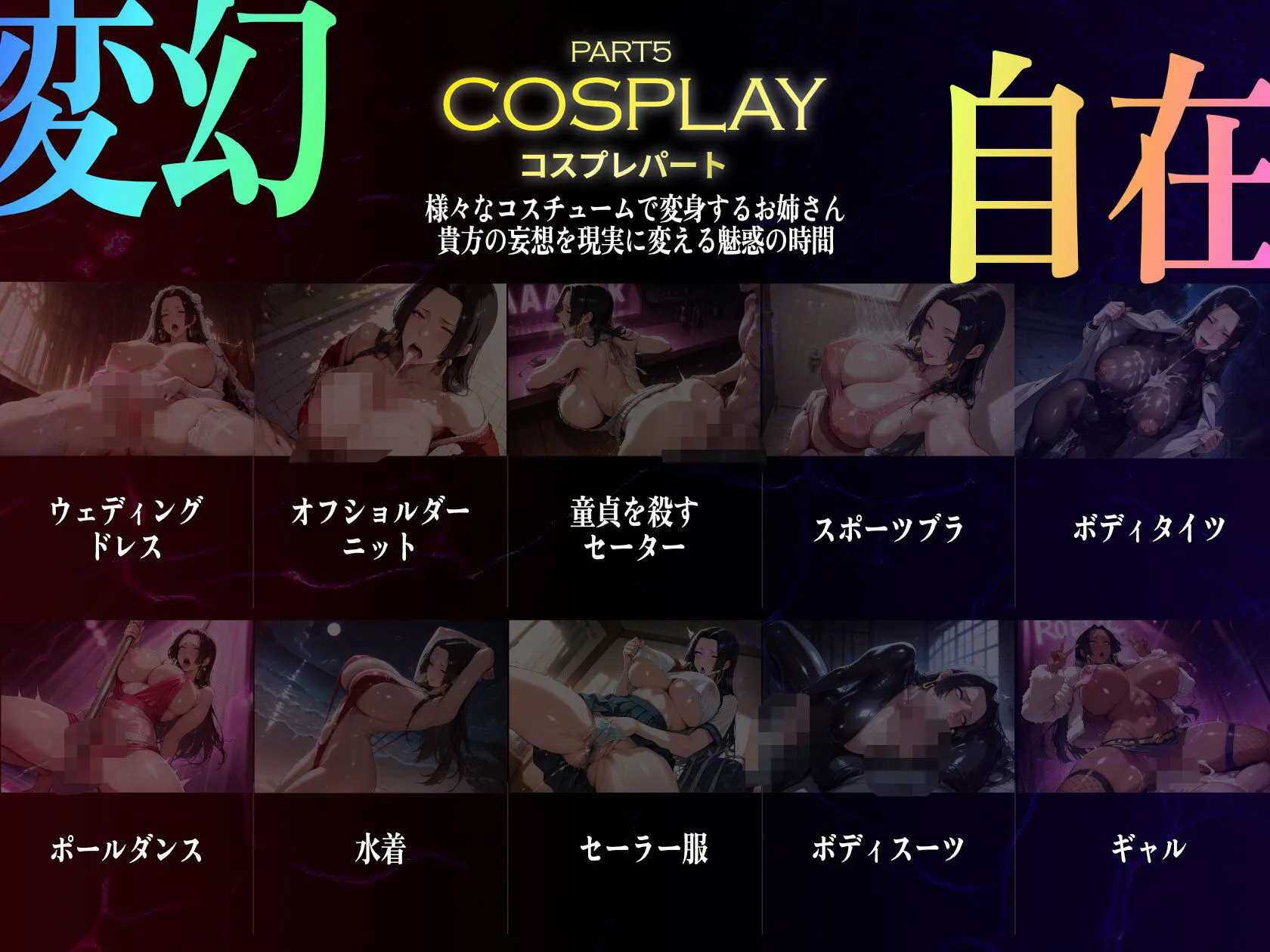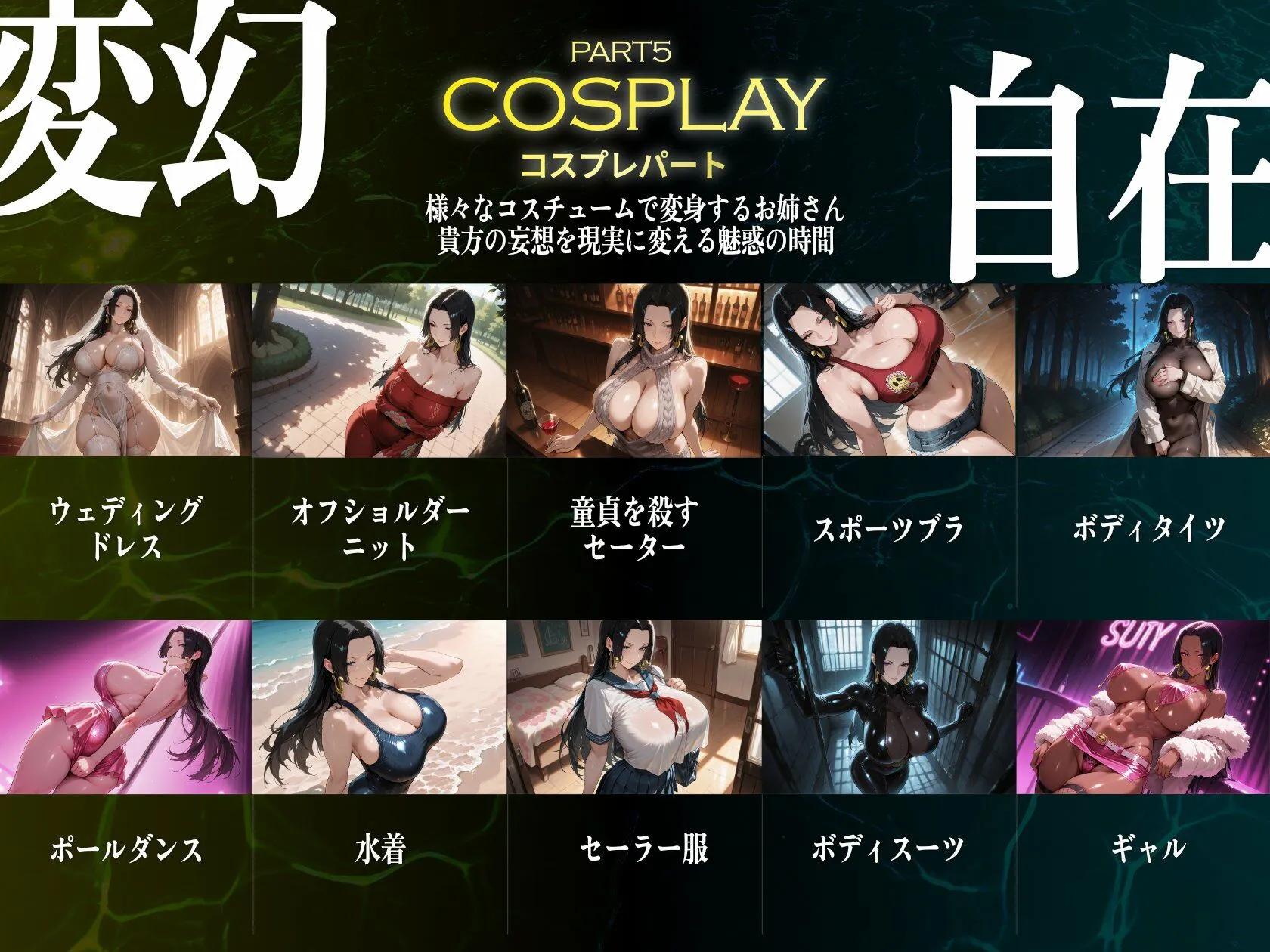 ウェディングドレス、オフショルダーニット、童貞を殺すセーター、スポーツブラボディタイツ、ポールダンス、水着、セーラー服、ボディースーツ、ギャルなのよ