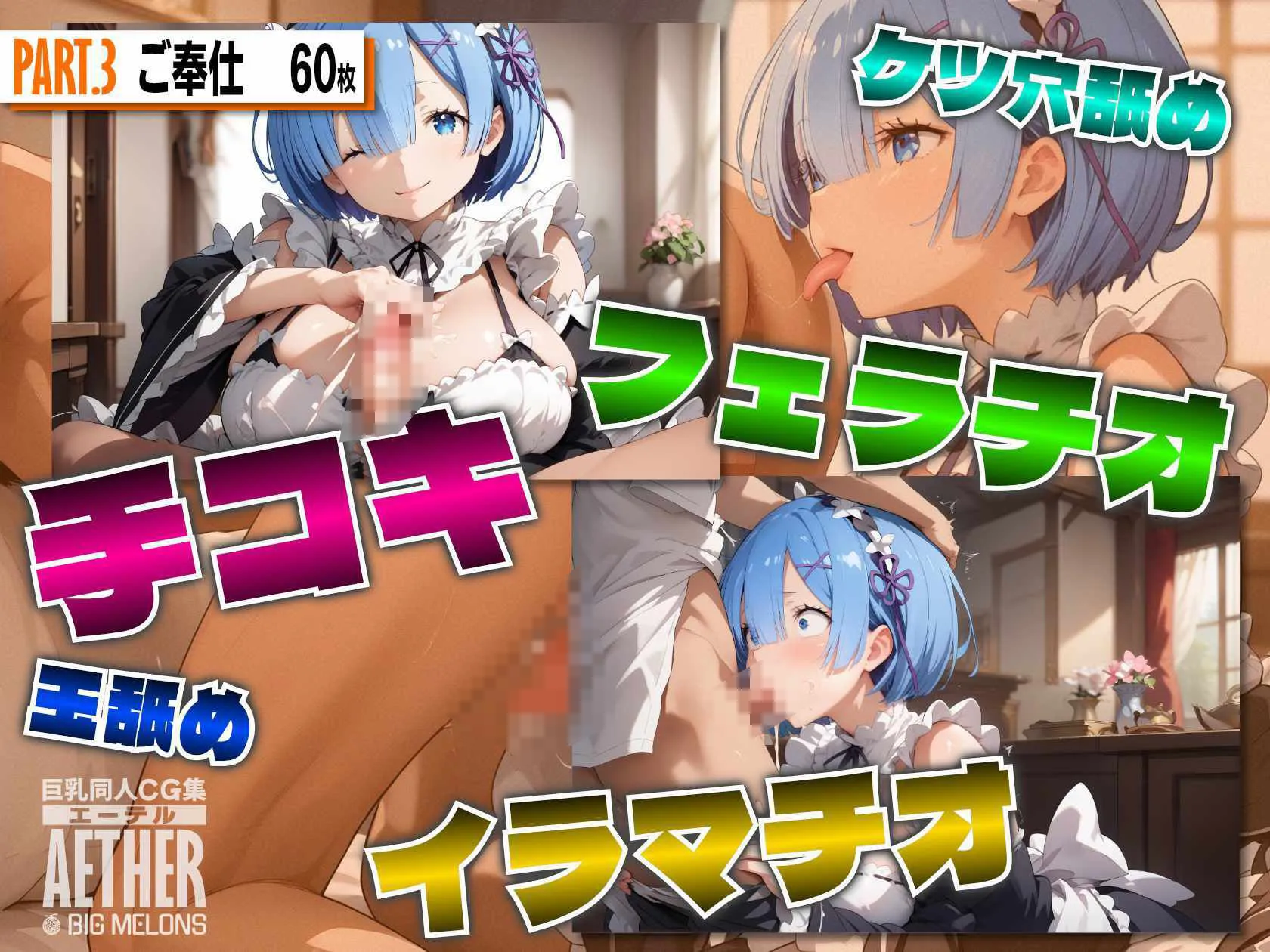 PART3はご奉仕60枚、手コキ、フェラ、ケツ穴舐め、イラマチオなどを収録。各シチュエーションで射精しまくりだよ