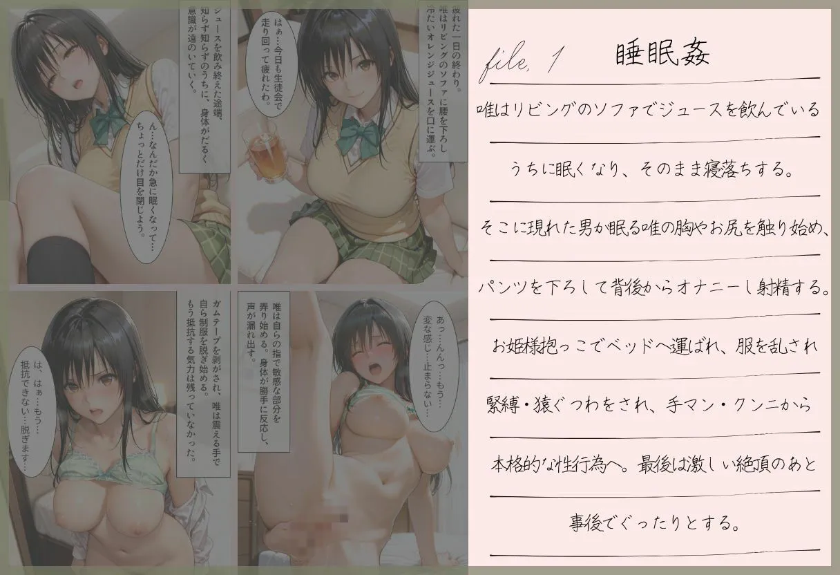 この作品はAI生成の睡眠姦から妊娠まで3つのストーリーで、古手川唯、西連寺春菜、金色のヤミが登場するんだよ