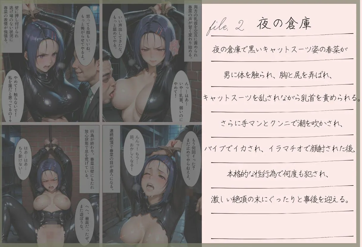 ストーリー2は夜の倉庫で縛られた大人の春菜、黒いキャットスーツ姿の西連寺春菜が捕まって両手首縄で壁拘束されるの