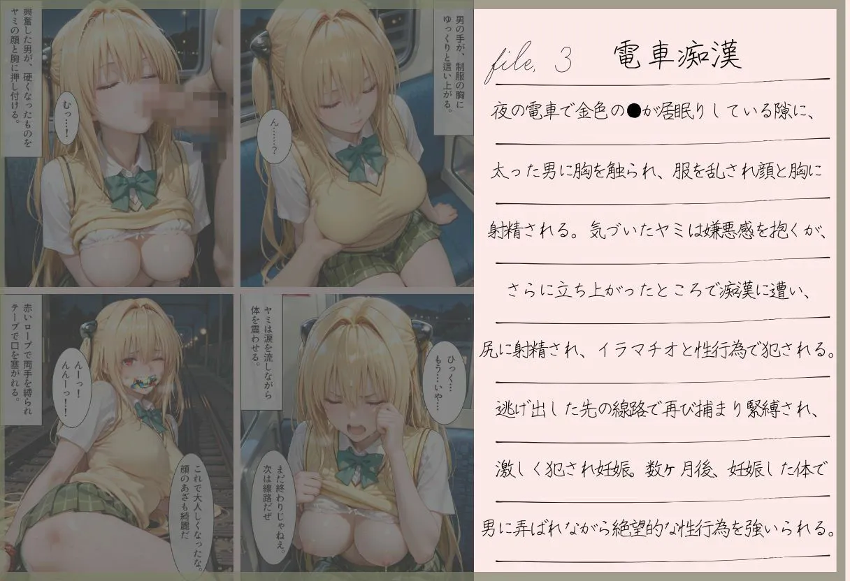 ストーリー3は電車痴漢で、夜の電車で金色のヤミが居眠りしてる隙に太った男に胸触られ服乱され顔胸射精されるの