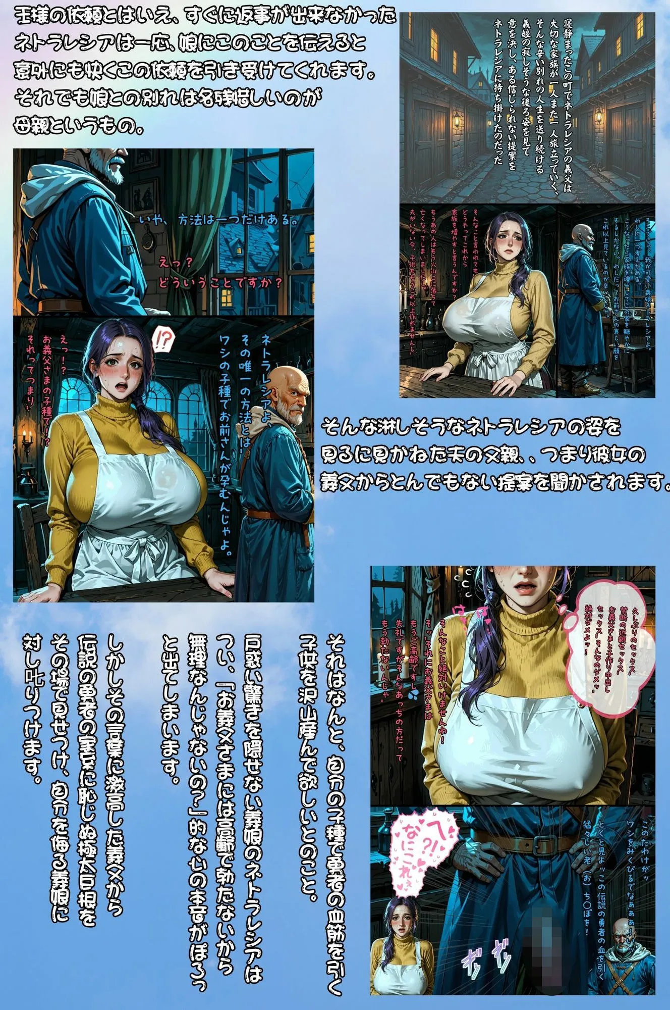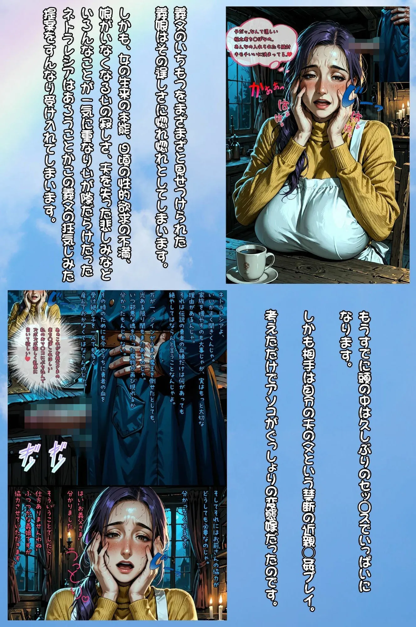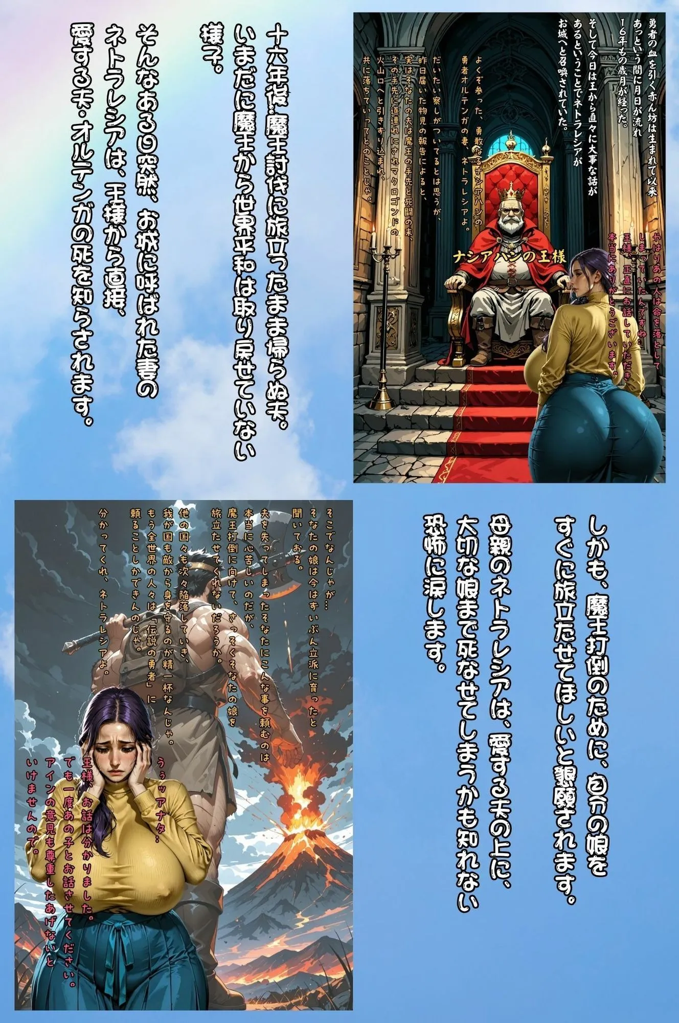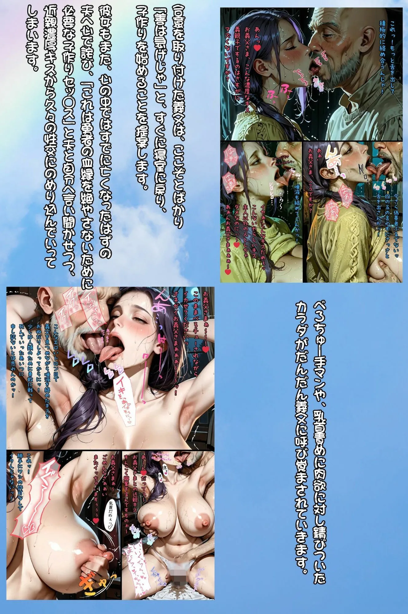 作品紹介:ドラゴンク〇スト3の世界観をモチーフに、「義父と嫁」をテーマにしたAIアダルトパロディ作品となります。嫁は義父から見た場合、血縁のない義娘となりますが、この義娘が女勇者(ゲームの主人公にあたる)の母と同居している夫の父(=義父にあたる)と繰り広げる近親寝取られ物語です。コメント:SFC版のゲーム冒頭、母と老人(オル〇ガの父だそう)の会話を見ながら、妄想を膨らませて、義父と嫁(義娘)の近親○姦作品に仕立て上げてみました。本作品はゲームをプレイしたことがなくてもお楽しみいただけますが、知っているとより面白いと思います。※義父から見て主役のネトラレシア(女勇者の母)は義娘になりますが、息子の妻のことを「嫁さん」とも呼ぶそうなので、作品内では「ネトラレシア=寝取られシア(皮肉を込めて)」、「義娘(=むすめ)」、または「嫁(=よめ)」という呼び方をしていますが、すべて同じ人物を指します。※読み:おち〇ぽ=老(お)ち〇ぽになります。ストーリーのあらすじ:恐れ入りますがサンプル画像を参照ください。※作品内から無作為ですが、別途体験版サンプル10Picsもご用意しております。あくまで作品の画像イメージを把握いただくことが目的ですので、ストーリーとしてお読みいただけませんのでご了承ください。目次:P.1主な登場人物P.2〜P.145義父と義娘ネトラレシアの寝取られ子作り物語P.147〜P.162アナザーストーリー〜娘の女勇者が旅立ったその後〜女勇者触手凌●編P.163御礼プレイ:※基本、キス&べろちゅうシーンが多め。○義娘ネトラレシア-前戯べろちゅー、乳首責め、搾乳、クンニ、フェラ&顔射、手マンWITHべろちゅう、腋舐め、搾乳&手コキ-体位※中出し断面図有り。寝バック正常位(ノーマルPOV、だいしゅきホールド&DK、顔面IN爆乳埋没ホールド)騎乗位(主に側面アングル)バック&ケツ叩きプレイ、立ちバック(片足立ち全開脚有り)&振り向きべろちゅーアクロバティックポーズ対面座位/背面座位(べろちゅー付き)妊婦腹オホ顔性交○孫娘の女勇者アインセルフ乳首吸い、指オナニー、義父とべろチュー、手マン責め(挿入は基本なし)触手モンスターによる二穴責め触手レ〇プ【注意事項】・本作品はすべてSeaartによるAI生成による画像集です。・AI生成による画像のため、手足や衣服の表現に多少違和感なものが含まれる場合がございます。予めご理解、ご了承の上、ご検討・ご購入ください。※登場人物の衣服や背景、特に男性サイドの顔や体型は必ずしも完全一致するものではありませんので、ご了承の程お願いいたします。・本作品はAI生成品のため、不自然さをなくす、または極力減らす目的で陰部以外の箇所(特に手の部分)にも、Canvaのマジック消しゴム機能や、薄くぼかし加工をしております。・画像サイズ:1360×2048(縦型)・本作品は1枚〜複数分割構成の画像で構成されております。・登場人物はすべて20才以上となります。
