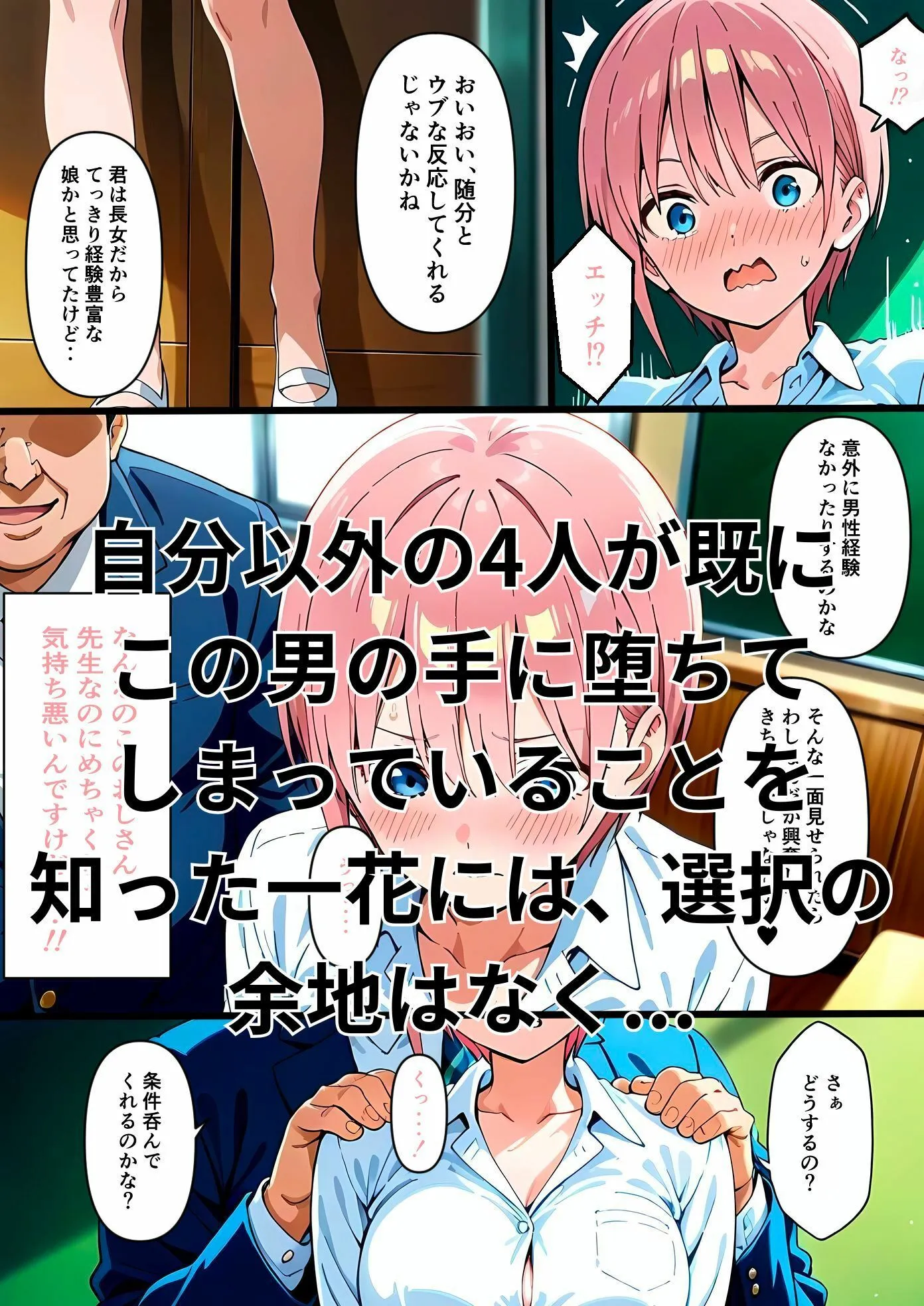 あかね前回の続きで、四葉、五月、二乃、三玖に手を出して堕とした教師がついに姉妹の最後の一人である一花に目をつけたんだよ