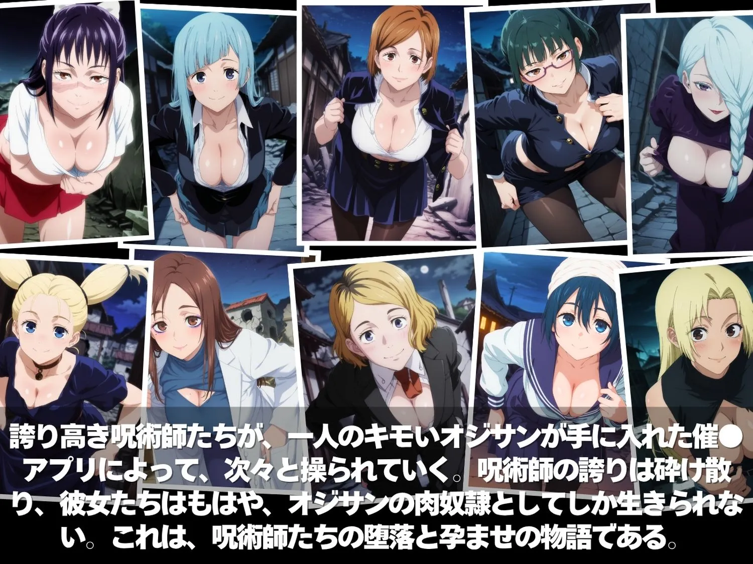 キモ男の逆襲。孕ませ完全征服!全員ペット化計画。呪術師の堕落と肉便器物語。〜呪術●戦編〜■コンセプトCG集(セリフなし)誇り高き呪術師たちが、一人のキモいオジサンが手に入れた催◯アプリによって、次々と操られていく。呪術師の誇りは砕け散り、彼女たちはもはや、オジサンの肉奴●としてしか生きられない。これは、呪術師たちの堕落と孕ませの物語である。■登場キャラクター釘崎野●薇三●霞唐●姫禪●真希冥●西●桃禪●胡子新●明天●理子九●九由基■収録枚数各キャラ50枚合計:500枚■プレイ属性キス/クンニ/手コキ/パイズリ/フェラチオ/顔射/立ちバック/駅弁/正常位/騎乗位/バック/中出し/ぶっかけ/妊娠/■画像仕様(縦)1344px1728px拡張子|PNGファイルダウンロード形式|ZIPファイル■注意事項キャラクターや衣装のデザインは、当サークル制作のイラストをもとにAI生成しています。本作品に登場するキャラクターは成人として設定されており、登場人物はすべて架空の存在です。