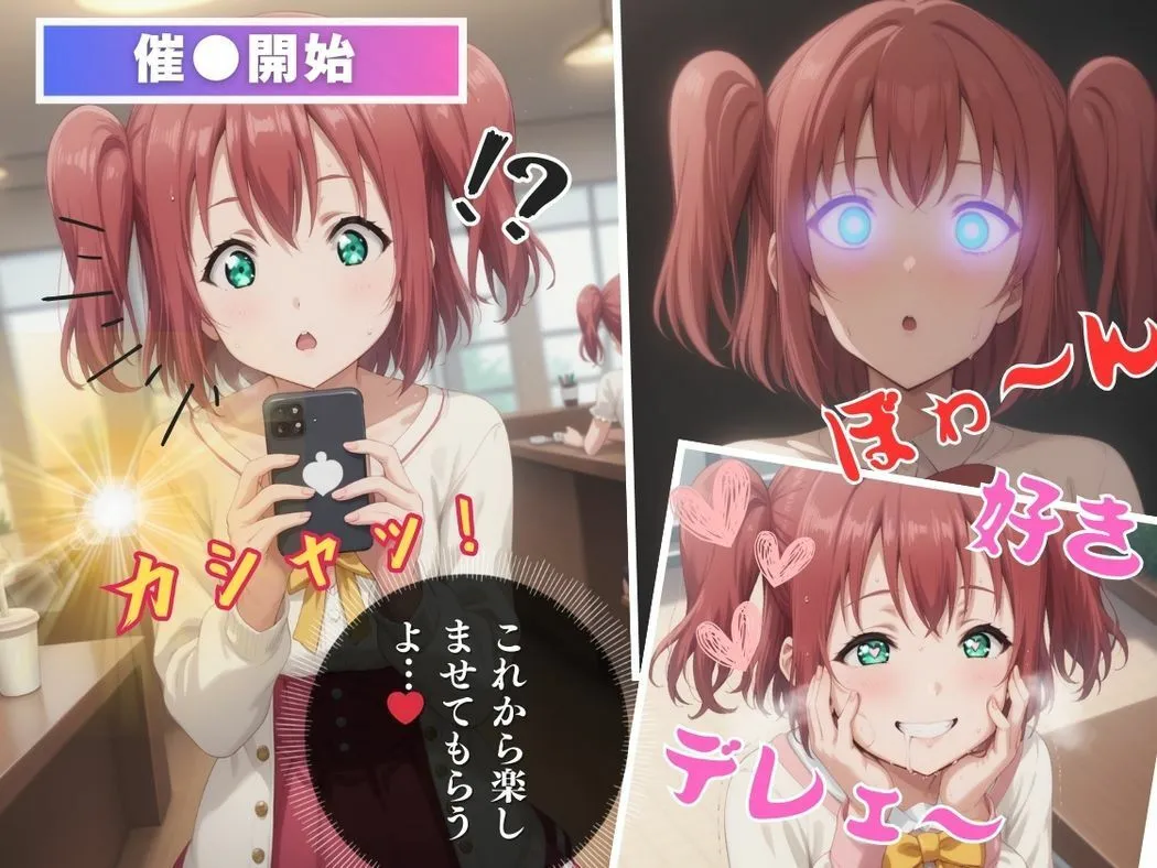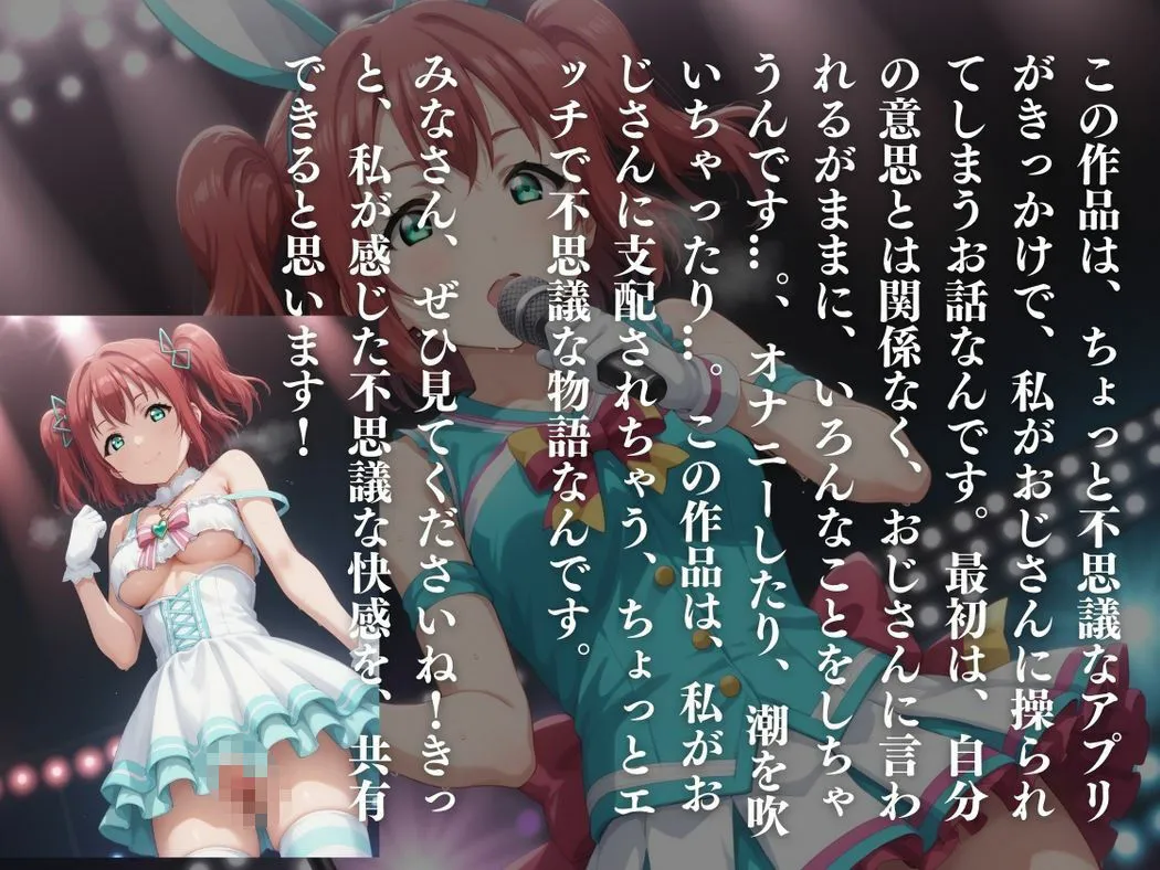 あかねこの作品は『キモ男の淫らなアプリ調教お嬢様の秘められた欲望、アプリが解き放つ』で、Aqoursのメンバーとして知られる黒●ルビィが謎のアプリでおじさんに支配されて堕ちていくCG集だよ