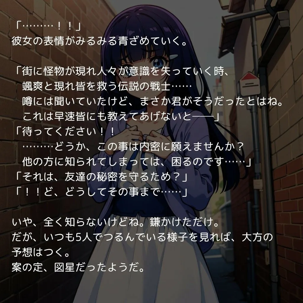 岡田が『街に怪物が現れ人々が意識を失っていく時、颯爽と現れ皆を救う伝説の戦士……噂には聞いていたけど、まさか君がそうだったとはね。これは早速皆にも教えてあげないと──』って脅すわ