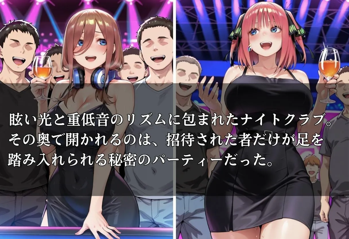 ※サンプル画像は本編より荒く、モザイクも大きくなっております。※アナルは全て無修正となります。【登場人物】・中野三玖・中野二乃【ストーリー】眩い光と重低音のリズムに包まれたナイトクラブ。その奥で開かれるのは、招待された者だけが足を踏み入れられる秘密のパーティーだった。シャンパンの泡が弾ける音、妖しく揺れる照明。ふと交わる視線が、まだ言葉を交わさぬうちに心をざわめかせる。それは偶然の出会いではなく、今夜を待ち望んでいたかのような必然。甘いキスから始まるささやかな触れ合いは、やがて抑えきれない欲望へと変わっていく。熱を帯びた吐息、絡み合う手と手。誰もがタブーを忘れ、快楽に身を委ねていく。時間が経つにつれ、フロアはさらに熱狂を増し、複数の影が交錯する。嫉妬も遠慮も、ここでは意味を持たない。ただその場の鼓動と欲望だけが真実で、誰もが抗えずに呑み込まれていく。そして夜が終わりを告げる頃、残るのは満ち足りた余韻と、決して語られることのない秘密。あの夜の記憶は、夢か現実かもわからぬまま、心に焼き付いて離れない――。【シーン】手コキ手マン挿入足コキイラマチオフェラ中出しクンニ顔射アクメ騎乗位正常位立ちバック全裸側位背面騎乗位立ちバック正常位くばあ口内射精四つん這いetc…※この作品はAIを利用して作成したものです。※StableDiffusionを使用して生成しております※技術的な制約やAIの学習データによって、細部に破綻や不自然さが含まれる場合があります。購入前に、そのことを理解し、同意した上で購入を検討していただくことをお願いいたします。※購入後の取り扱いに不備があった場合こちらは一切責任を負いません。※商用目的での利用・第三者への譲渡・転載等が発見された際には法的処置をとらせていただき、損害賠償請求を致します