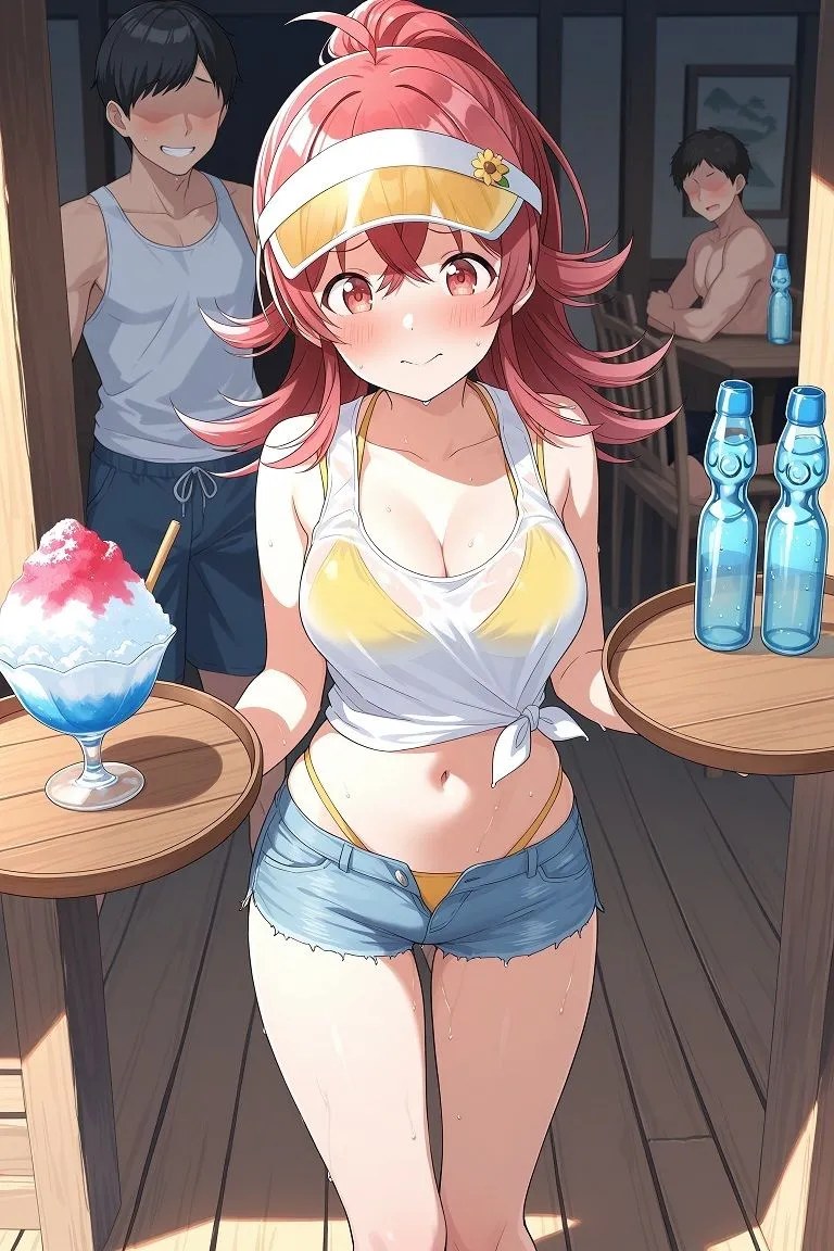 バイト慣れの4.慣れ接客風景は20枚、タンクトップとホットパンツなしの水着だけで接客、もう恥ずかしがらずセクハラにも笑顔よ